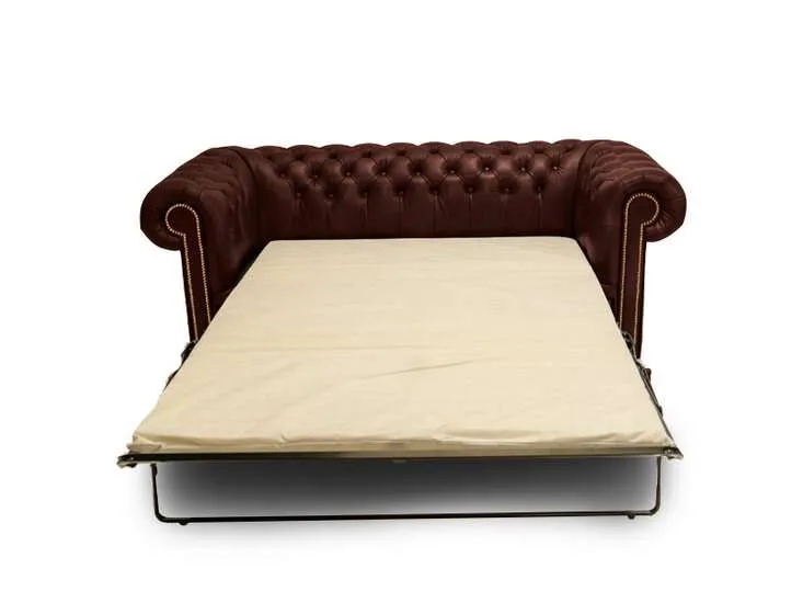 Chesterfield Sofa Bed First Class Cloudy RedRuka majstora u ovim komadima namještaja od goveđe kože jasno je prepoznatljiva po lijepo izrađenim detaljima, poput zakovica i tapeciranih rukohvata i naslona.Jedan od najvažnijih materijala prilikom proizvodnje kvalitetnog Chesterfielda je koža. Chesterfield namještaj ručno je izrađen od visokokvalitetne poluanilinske kože, koja se zatim lakira.Okvir je izrađen od bukovine, koja je zalijepljena i vijčana. Duga tradicija zanatskog umijeća vidljiva je kroz udobnost i izgled Prve klase.Chesterfield model ‘Prva klasa’ je model koji svi poznajemo kao pravi Chesterfield. Ovaj Chesterfield model dostupan je samo u goveđoj koži i dostupan je kao Klasa i Prva klasa.Sklapajući ležaj sakriven je u kauču i ima sljedeće dimenzije: širina 145 cm i duljina 195 cm.Uz svaki komad namještaja standardno se pruža certifikat autentičnosti i jamstvo kvalitete.Tehnički podaci