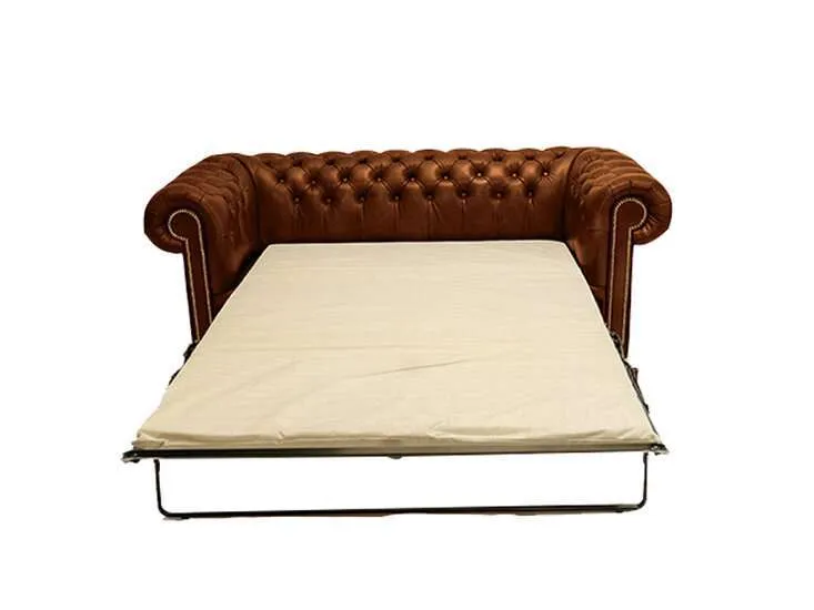 Chesterfield Sofa Bed First Class Cloudy CaramelRuka majstora u ovim komadima namještaja od goveđe kože jasno je prepoznatljiva po lijepo izrađenim detaljima, poput zakovica i tapeciranih rukohvata i naslona.Jedan od najvažnijih materijala prilikom proizvodnje kvalitetnog Chesterfielda je koža. Chesterfield namještaj ručno je izrađen od visokokvalitetne poluanilinske kože, koja se zatim lakira.Okvir je izrađen od bukovine, koja je zalijepljena i vijčana. Duga tradicija zanatskog umijeća vidljiva je kroz udobnost i izgled Prve klase.Chesterfield model ‘Prva klasa’ je model koji svi poznajemo kao pravi Chesterfield. Ovaj Chesterfield model dostupan je samo u goveđoj koži i dostupan je kao Klasa i Prva klasa.Sklapajući ležaj sakriven je u kauču i ima sljedeće dimenzije: širina 145 cm i duljina 195 cm.Uz svaki komad namještaja standardno se pruža certifikat autentičnosti i jamstvo kvalitete.Tehnički podaci