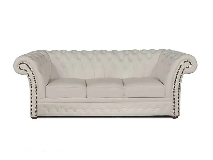 Chesterfield Winfield Basic Luxe leather 3-sjedišta sofa White Zanatska vještina u ovoj Chesterfield sofi od goveđe kože jasno je prepoznatljiva po lijepo završenim detaljima, poput zakovica i presvučenih naslona i leđa.Jedan od najvažnijih materijala pri proizvodnji kvalitetnog Chesterfielda je koža. Chesterfield namještaj izrađuje se ručno od visokokvalitetne poluanilinske kože, koja se zatim lakira.Okvir je izrađen od bukovog drveta, koje je zalijepljeno i vijcima pričvršćeno. Duga tradicija zanatskog umijeća vidljiva je kroz udobnost i izgled Winfielda.Chesterfield model ‘Winfield’ je model koji svi poznajemo kao pravi Chesterfield. Ovaj Chesterfield model od goveđe kože također je dostupan i u vintage koži i tkanini.Uz svaki komad namještaja standardno se isporučuje certifikat autentičnosti i premijerne garancije. Tehničke specifikacije