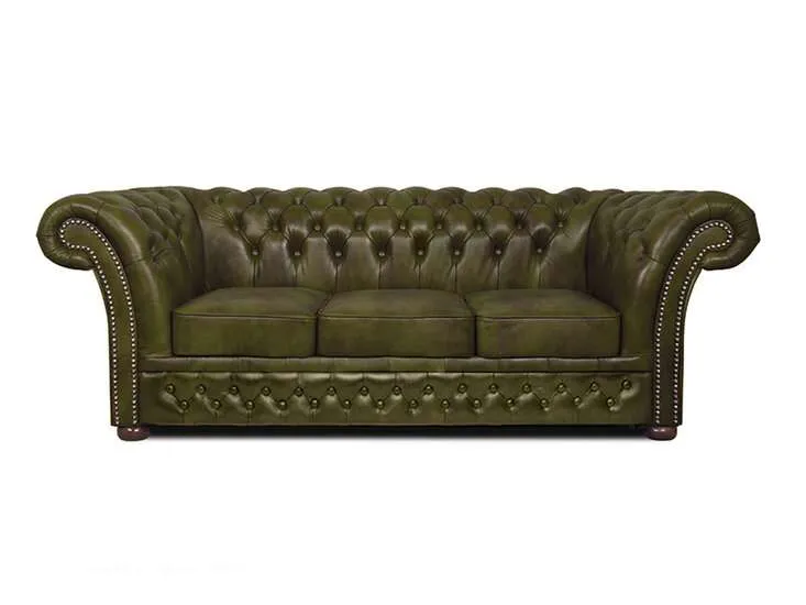 Chesterfield Winfield Basic Luxe leather 3-sjedišta sofa Moss Green Zanatska vještina u ovoj Chesterfield sofi od goveđe kože jasno je prepoznatljiva po lijepo završenim detaljima, poput zakovica i presvučenih naslona i leđa.Jedan od najvažnijih materijala pri proizvodnji kvalitetnog Chesterfielda je koža. Chesterfield namještaj izrađuje se ručno od visokokvalitetne poluanilinske kože, koja se zatim lakira.Okvir je izrađen od bukovog drveta, koje je zalijepljeno i vijcima pričvršćeno. Duga tradicija zanatskog umijeća vidljiva je kroz udobnost i izgled Winfielda.Chesterfield model ‘Winfield’ je model koji svi poznajemo kao pravi Chesterfield. Ovaj Chesterfield model od goveđe kože također je dostupan i u vintage koži i tkanini.Uz svaki komad namještaja standardno se isporučuje certifikat autentičnosti i premijerne garancije. Tehničke specifikacije