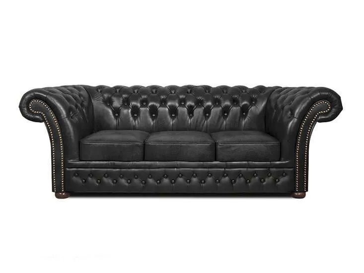 Chesterfield Winfield Basic Luxe leather 3-sjedišta sofa Shiny Black Zanatska vještina u ovoj Chesterfield sofi od goveđe kože jasno je prepoznatljiva po lijepo završenim detaljima, poput zakovica i presvučenih naslona i leđa.Jedan od najvažnijih materijala pri proizvodnji kvalitetnog Chesterfielda je koža. Chesterfield namještaj izrađuje se ručno od visokokvalitetne poluanilinske kože, koja se zatim lakira.Okvir je izrađen od bukovog drveta, koje je zalijepljeno i vijcima pričvršćeno. Duga tradicija zanatskog umijeća vidljiva je kroz udobnost i izgled Winfielda.Chesterfield model ‘Winfield’ je model koji svi poznajemo kao pravi Chesterfield. Ovaj Chesterfield model od goveđe kože također je dostupan i u vintage koži i tkanini.Uz svaki komad namještaja standardno se isporučuje certifikat autentičnosti i premijerne garancije. Tehničke specifikacije