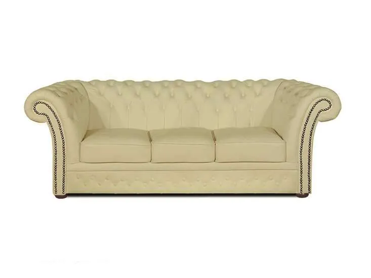Chesterfield Winfield Basic Luxe leather 3-sjedišta sofa Vanilla Zanatska vještina u ovoj Chesterfield sofi od goveđe kože jasno je prepoznatljiva po lijepo završenim detaljima, poput zakovica i presvučenih naslona i leđa.Jedan od najvažnijih materijala pri proizvodnji kvalitetnog Chesterfielda je koža. Chesterfield namještaj izrađuje se ručno od visokokvalitetne poluanilinske kože, koja se zatim lakira.Okvir je izrađen od bukovog drveta, koje je zalijepljeno i vijcima pričvršćeno. Duga tradicija zanatskog umijeća vidljiva je kroz udobnost i izgled Winfielda.Chesterfield model ‘Winfield’ je model koji svi poznajemo kao pravi Chesterfield. Ovaj Chesterfield model od goveđe kože također je dostupan i u vintage koži i tkanini.Uz svaki komad namještaja standardno se isporučuje certifikat autentičnosti i premijerne garancije. Tehničke specifikacije