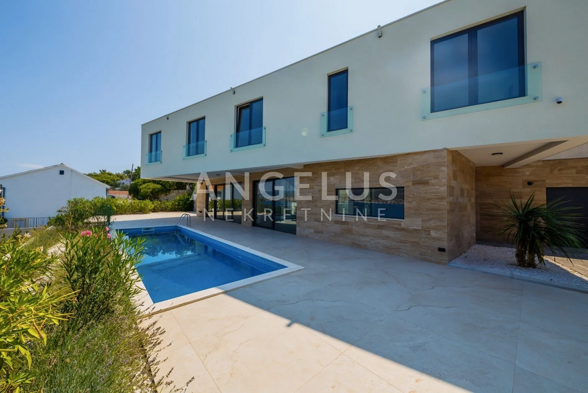 Prodaje se super luksuzna i moderna vila na tri etaže na otoku Čiovu, u drugom redu do mora. Proteže se na parceli ukupne površine 728 m2 sa ukupno 326 m2 stambenog prostora. Sastoji se od suterena, prizemlja i još jedne etaže, vanjskog grijanog bazena od 28 m2 te izuzetno uređenom okućnicom od 450 m².