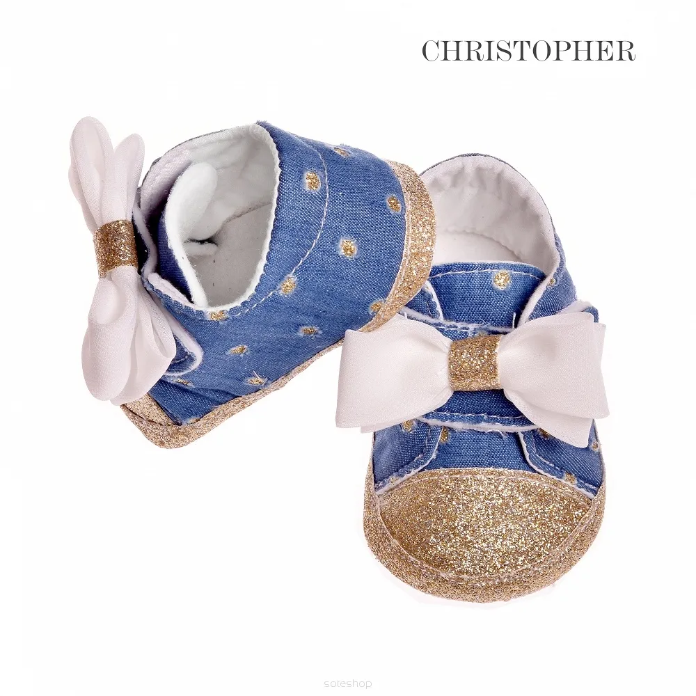 Cipele presvučene traperom s zlatnim sjajnim točkama s lijepim ukrasnim mašnama.