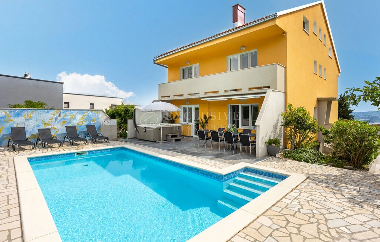 CRIKVENICA-KUĆA ZA ODMOR NA ODLIČNOJ LOKACIJI!! Prodaje se vrlo lijepa i uredna kuća za odmor na atraktivnoj lokaciji u Crikvenici, sa kuće se pruža lijepi pogled na more i okolicu. Kuća se sastoji od suterena, prizemlja, prvog kata i potkrovlja.U suterenu se nalaze dvije sobe, kuhinja, kupaonica s wc-om, velika ostava od 16 m2, kao i dvije garaže, svaka po cca 20 m2.Isto tako, u suterenu je smješten i apartman površine cca 30 m2, koji se sastoji od sobe, kuhinje i kupaonice s wc-om. U prizemlju je stan dvosoban s dnevnim boravkom, koji se sastoji od dnevnog boravka s kuhinjom ( cca 30 m2 ), dvije sobe, dvije kupaonice s wc-om i terase površine cca 15 m2.Na nivou prizemlja smještan je bazen površine 24 m2, kao i jacuzzi za 6 osoba.Na prvom katu su četiri sobe sa četiri kupaonice s wc-om, kao i terasa koja se proteže po cijeloj širini zgrade s obje strane.Na potkrovlju su također četiri sobe, dvije kupaonice s wc-om, čajna kuhinja, kao i jedna čajna kuhinja u pripremi. Kuća ima vrlo lijepu i prekrasno uređenu okućnicu.Na okućnici ispred garaža postoje četiri parkirna mjesta, kao i dva mjesta u garažama. Kuća je opremljena solarnom elektranom ( solarno zagrijavanje i sanitarna voda ), ima tri klima uređaja, ima centralno grijanje na struju, instalirano je i centralno grijanje na plin, koje ima i svoje spremište za plin. Kuća je kompletno renovirana 2022. godine i zaista je u odličnom stanju, prodaje se kompletno namještena vrhunskim namještajem. Trenutno je u funkciji kuće za odmor i kategorizirana je s četiri zvjezdice. Uz male preinake kuća može biti u funkciji obiteljske kuće. Od mora kuća je udaljena cca 900 m zračne linije, cestom je udaljenost cca 2 km. ODLIČNA NEKRETNINA NA LIJEPOJ LOKACIJI!!! NEKRETNINA ODLIČNA ZA POSAO, KAO I ZA OBITELJSKI ŽIVOT!!! CRIKVENICA-HOLIDAY HOUSE IN A GREAT LOCATION!! A very nice and tidy holiday house for sale in an attractive location in Crikvenica, the house offers a beautiful view of the sea and the surrounding area. The house consists of a basement, ground floor, first floor and attic. In the basement there are two rooms, a kitchen, a bathroom with a toilet, a large storage room of 16 m2, as well as two garages, each approx. 20 m2. Likewise, in the basement there is also an apartment of approx. 30 m2, which consists of a room, a kitchen and a bathroom with a toilet. On the ground floor is a two-bedroom apartment with a living room, which consists of a living room with a kitchen (approx. 30 m2), two bedrooms, two bathrooms with a toilet and a terrace of approx. 15 m2. On the ground floor there is a swimming pool with an area of 24 m2, as and a jacuzzi for 6 people. On the first floor there are four rooms with four bathrooms with toilets, as well as a terrace that stretches across the entire width of the building on both sides. In the attic there are also four rooms, two bathrooms with toilets, a kitchenette , as well as a kitchenette in preparation. The house has a very beautiful and beautifully landscaped garden. There are four parking spaces in the garden in front of the garage, as well as two spaces in the garage. The house is equipped with a solar power plant (solar heating and sanitary water), it has three air conditioners, it has electric central heating, gas central heating is also installed, which also has its own gas storage. The house was completely renovated in 2022 and is in really excellent condition, it is sold fully furnished with top quality furniture. It is currently in operation as a holiday home and is categorized with four stars. With small modifications, the house can function as a family home. The house is approx. 900 m away from the sea as the crow flies, the distance by road is approx. 2 km. EXCELLENT PROPERTY IN A BEAUTIFUL LOCATION!!! PROPERTY EXCELLENT FOR BUSINESS AND FAMILY LIFE!!! ID KOD AGENCIJE: 2203 Darko Milneršić Organizator kupoprodaje nekretnina Mob: +385 (0) 95 862 2365 Tel: +385 (0) 51 498 068 E-mail: darko@exclusive-nekretnine.hr www.exclusive-nekretnine.hr