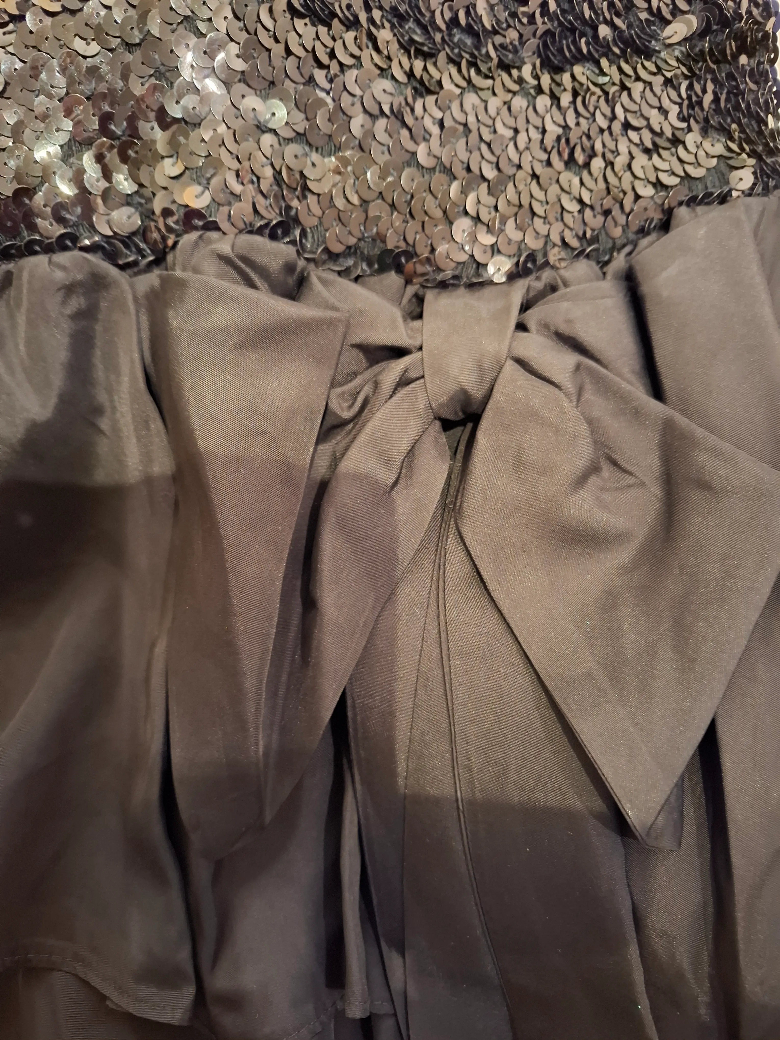 Prodajem crnu svečanu haljinu marke "C&A" kupljenu u Njemačkoj. Veličina 40. Obučena samo jednom za jednu svečanu prigodu. Haljina je očuvana, bez oštećenja i fleka, original iz 90-tih godina.Mjere: dužina 79cm, širina skroz gore kod grudi 29cm (ima guma). Sastav: 60% polyester, 30% acrly, 10% elastin.