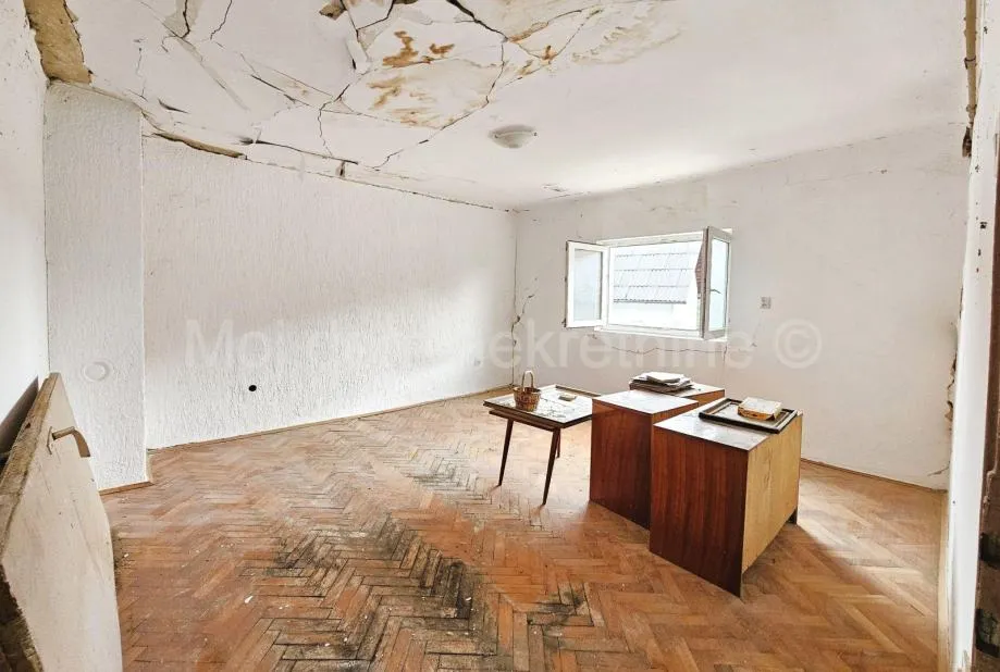 Kuća je nastradala u potresu (crvena naljepnica). Ima priključke vode, struje i plina te sabirnu jamu.