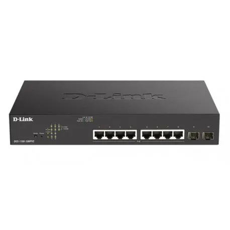 D-LINK switch DGS-1100-10MPV2 / MAX POE / 8-Port 100BaseTX Auto-Negotiating 10/100/1000Mbps Switch / 2 SFP 1000 Mbps / Fanless / 802.1Q VLAN / 802.1p QoS / IGMP snooping / Loopback detection
