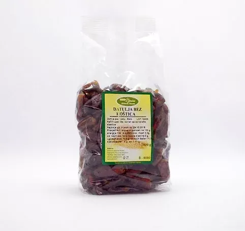 Osušeni plodovi datulja bez koštica. Zemlja podrijetla: Iran. Koristi se kao prirodni zaslađivač kod pripreme slastica, kolača ili kao hranjivi samostalni međuobrok.