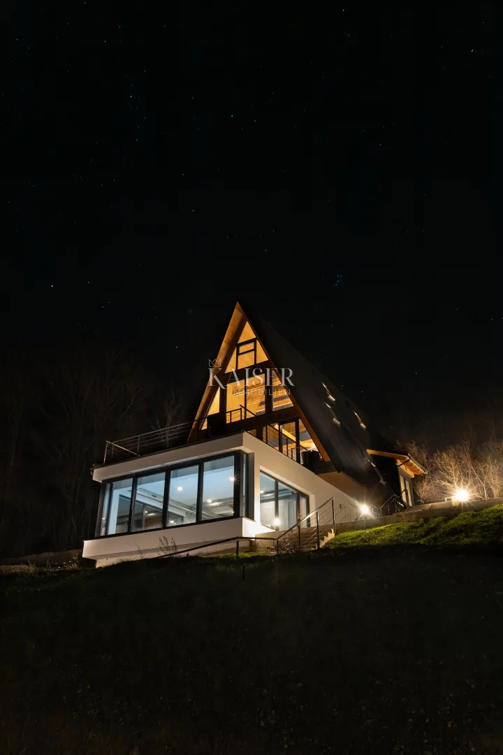 Kaiser Immobilien agencija predstavlja ekskluzivnu planinsku A-frame vilu s unutarnjim bazenom, wellnesom i očaravajućim pogledom u okolici Delnica. Na nadmorskoj visini od 510 metara, u tišini brdovitog krajolika iznad Delnica, smještena je jedinstvena A-frame vila koja objedinjuje suvremeni luksuz, vrhunsku gradnju i duboku povezanost s prirodom. Okružena šumom i smještena na prostranoj građevinskoj parceli od 1.088 m², vila nudi rijedak osjećaj privatnosti, mira i potpunog odmaka od svakodnevice, uz otvorene poglede koji se mijenjaju s godišnjim dobima. Arhitektura kuće pažljivo je osmišljena kako bi se nenametljivo uklopila u prirodni reljef terena, naglašavajući harmoniju s okolišem i svijest o važnosti uklapanja u prirodnu kulisu. Kombinacija betonskog suterena i drvene nadogradnje, uz 30 cm izolacije od kamene vune i limeni krov, osigurava dugotrajnost, energetsku učinkovitost i ugodnu atmosferu tijekom cijele godine. Velike panoramske staklene stijene duž istočne strane brišu granicu između interijera i eksterijera, dopuštajući prirodnom svjetlu i zelenilu da postanu sastavni dio svakodnevnog boravka. Vila se prostire na približno 296 m² raspoređenih kroz četiri etaže. U suterenu se nalazi elegantno uređen wellness prostor s ostakljenim, grijanim unutarnjim bazenom, u potpunosti opremljenim za korištenje tijekom cijele godine, idealnim za opuštanje uz poglede na šumu i tišinu planinskog okruženja. Prizemlje, površine veće od 110 m², oblikovano je kao prostran i iznimno svijetao open-space prostor koji povezuje kuhinju, blagovaonicu i dnevni boravak. Iz ovog dijela izlazi se na veliku, nenatkrivenu terasu s koje se pruža nesmetan pogled na netaknutu prirodu i brežuljke Gorskog kotara. Na istoj etaži nalaze se dvije udobne spavaće sobe, svaka s vlastitom kupaonicom. Na gornjim etažama – potkrovlju i tavanu – smještene su još tri spavaće sobe i dodatna kupaonica. Posebnu čar pruža tavanski prostor površine oko 40 m², uređen kao intimna spavaća ili lounge zona, s panoramskim prozorima koji uokviruju šumski pejzaž i stvaraju osjećaj boravka u prirodi, čak i iz topline interijera. Za vrhunsku razinu komfora ugrađene su tri Ariston toplinske pumpe s podnim grijanjem te šest Daikin klima uređaja, uz individualnu regulaciju temperature u svakoj prostoriji i mogućnost daljinskog upravljanja putem mobilne aplikacije. Vila je smještena na blagom brežuljku, udaljena od glavne ceste, s vlastitim pristupnim putem i parkiralištem za više vozila. Okruženje obiluje prirodnim ljepotama – šumama, planinskim zrakom i tišinom, dok su Delnice udaljene svega 4 km, rijeka Kupa te Zeleni vir i Vražji prolaz oko 7 km, a autocesta je dostupna unutar desetak minuta vožnje. Kategorizirana za turističko iznajmljivanje, ova nekretnina predstavlja savršenu ravnotežu između luksuzne planinske rezidencije i atraktivne investicije, mjesta gdje se suvremeni komfor susreće s bezvremenskom ljepotom prirode Gorskog kotara. Predivna brdovita lokacija, netaknuta priroda i izniman mir poklanjaju stanovnicima ove vile beskrajno uživanje da li kroz zelene boje tijekom toplijih dana ili očaravajući bijeli pokrivač u zimskim danima. Agencijska provizija za kupca iznosi 3% + PDV i plaća se samo u slučaju kupnje nekretnine, pri sklapanju prvog pravnog akta. Za daljnje informacije obratite se na: Marijana Cuculić Telefon: + 385 98 186 9950 E-mail: marijana.cuculic@kaiser-immobilien.hr ID KOD AGENCIJE: 135-78 Marijana Svijetlana Cuculić Agent posredovanja u prometu nekretnina Mob: +385981869950, +385995677888 E-mail: marijana.cuculic@kaiser-immobilien.hr www.kaiser-immobilien.hr