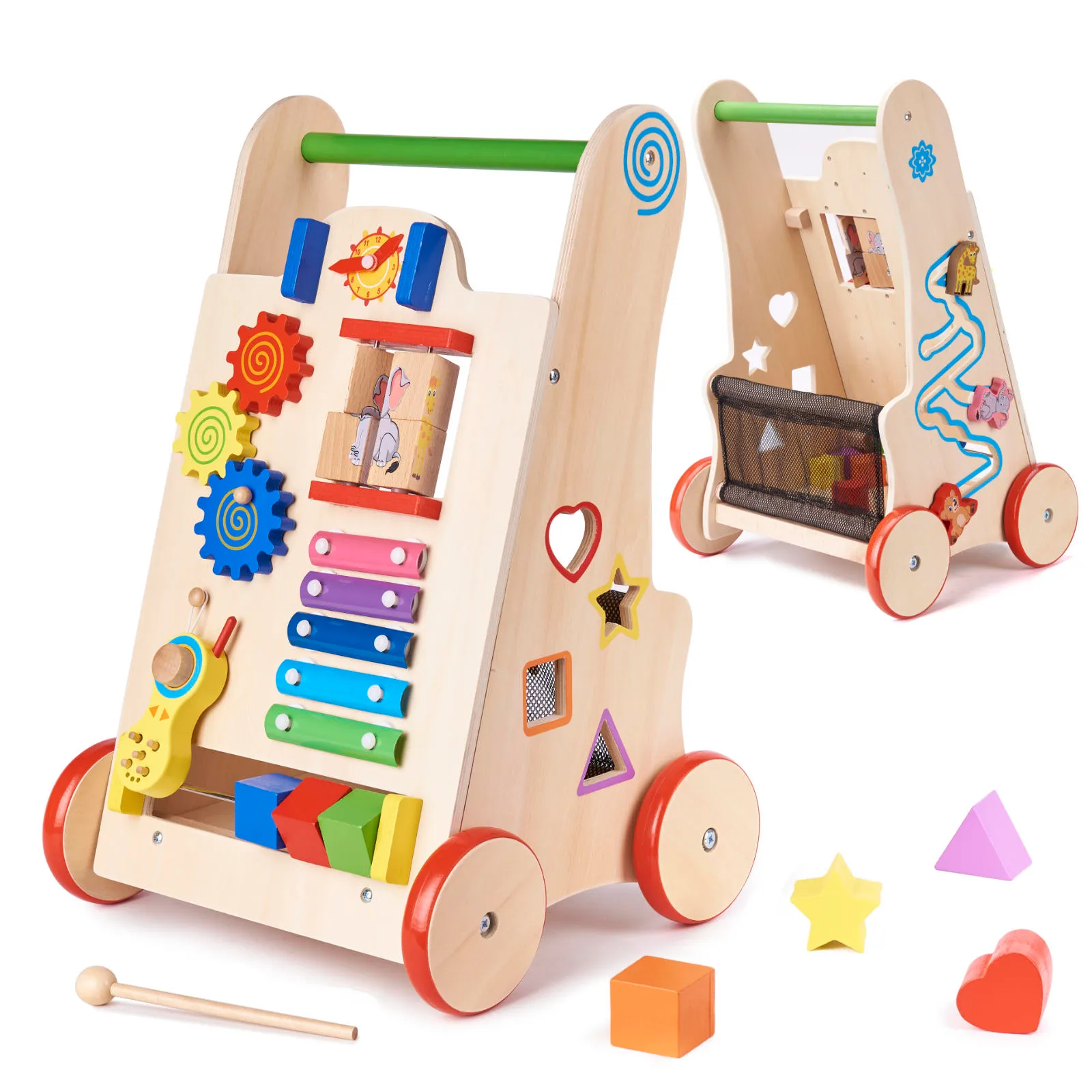 Ova guralica je više od hodalice. Ona je i zabavna didaktička igračka. Prednja strana nudi mnogo aktivnosti: sat s pomičnim kazaljkama, slagalicu sa slikama, ksilofon s batićem i šareni abacus. Dijete će moći okretati zupčanike, pritiskati tipke na telefonu i istraživati nove zvukove. S jedne strane nalazi se sorter za oblike, a na stražnjoj strani labirint sa životinjama.