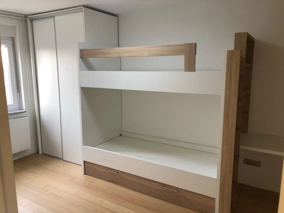 Krevetom na kat i pomoćnim krevetom u ladici,sklizni ormar i radni stol