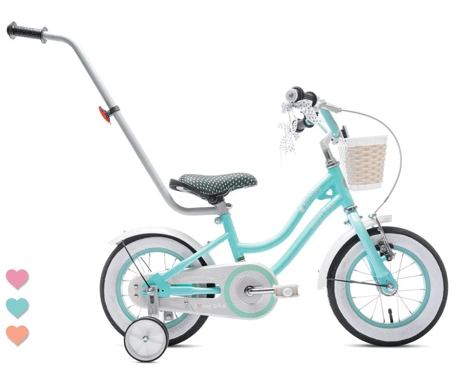 Dječji bicikl guralica Heart 12" mint Nova verzija elegancije na dva kotača. Oprema uključuje: prednji i stražnji blatobrani, udobno sjedalo s vodilicom (guralicom), odvojivi pomoćni kotači, zaštićeno kućište lanca, kočnicu prednjeg kotača, zvono, prednju košaru. Težina bicikla: 9,5 kg