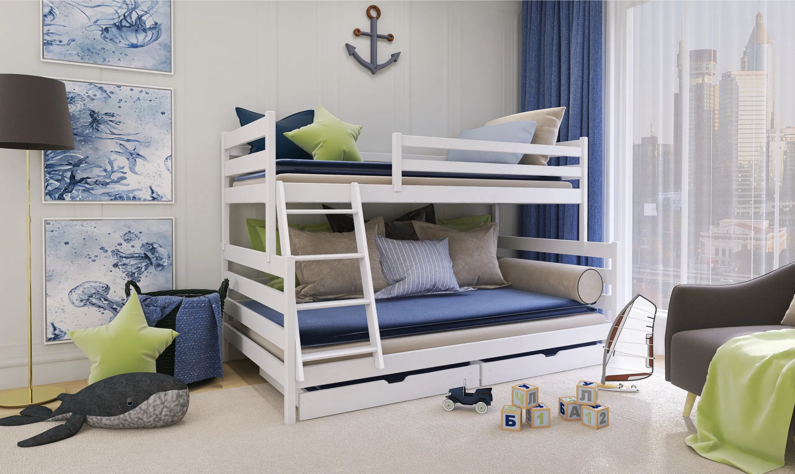 Dječji krevet na kat FAMI je idealan za manje prostore zahvaljujući dodatnim ladicama koje omogućuju spremanje posteljine, igračaka ili knjiga. Ovaj model kreveta savršen je za obitelji koje žele funkcionalnost i urednost u dječjoj sobi.