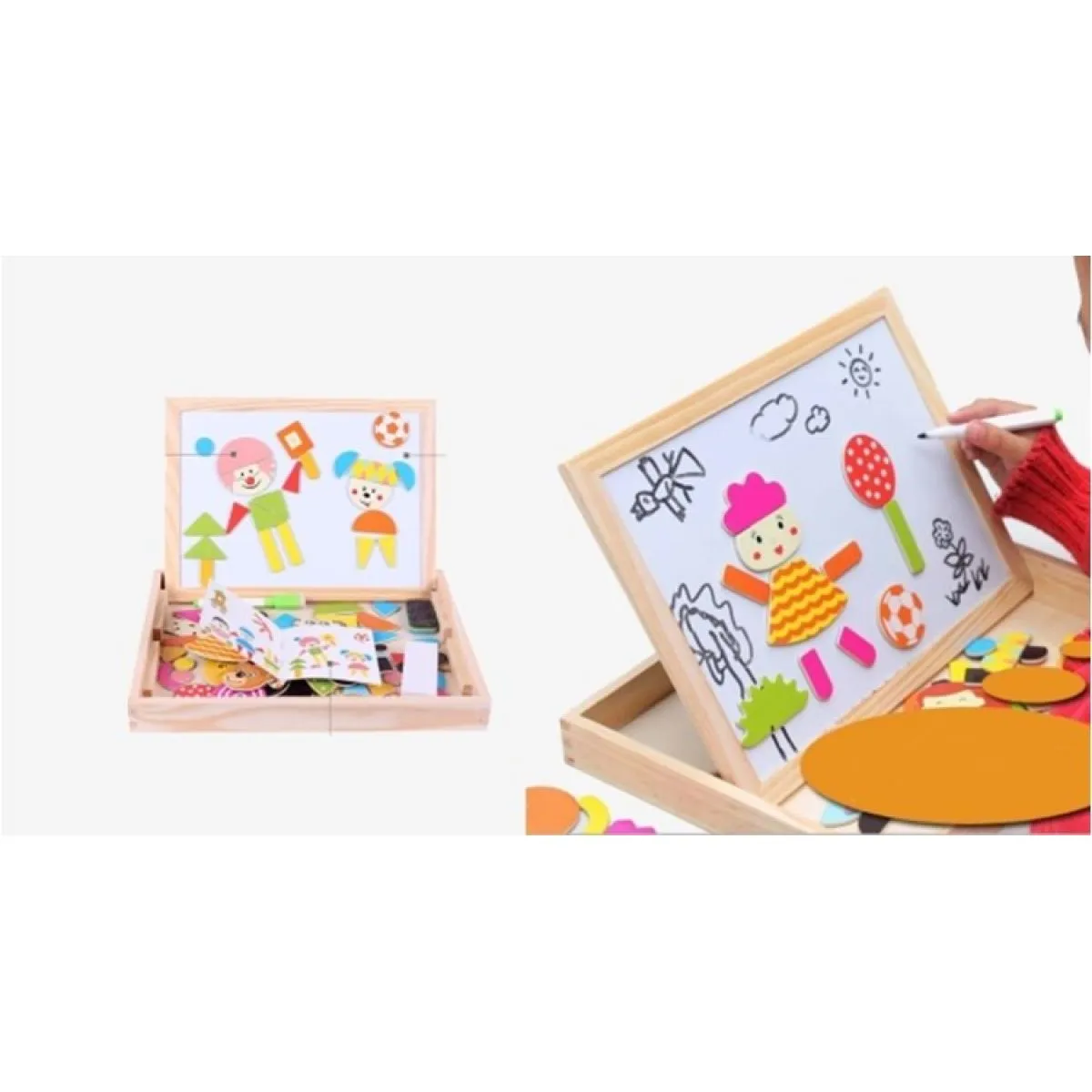 Ovaj set za djecu zaokupit će djetetovu pažnju kao da je privlači magnetom! Kada se otvori ova čarobna kutijica, u njoj će mališani pronaći vesele magnetske likove koje će moći stavljati na ploču kako god im se sviđa. Sigurno će satima uživati slažući razne prizore po ploči i tako razvijati svoju kreativnost! No, ni o nije sve, s druge strane je obična ploča za pisanje po kojoj vaš mališan može satima pisati, crtati i brisati i tako ispočetka.