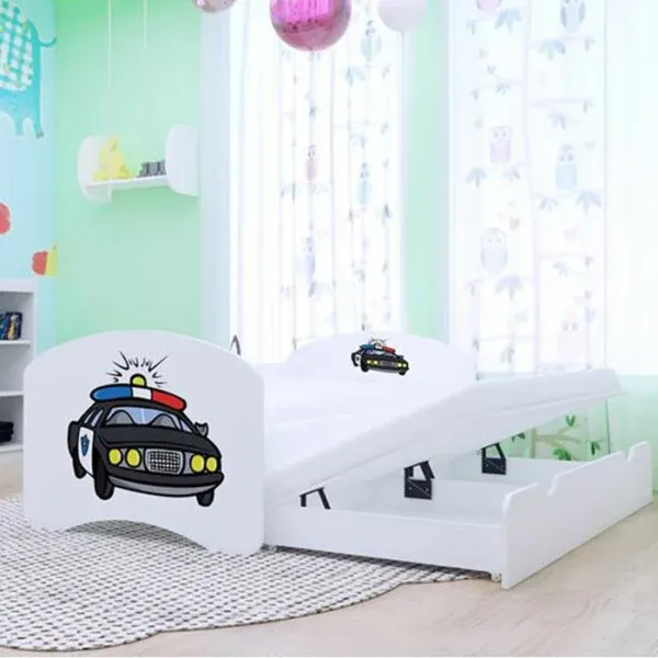 Kod kuće imate dvoje mališana ili želite uvijek imati u spremnosti dodatni ležaj? Ovaj dupli dječji krevet će vam to i omogućiti. Dupli kreveti su odličan izbor u slučaju kada vaše dijete organizira ludi pidžama party, kada imate dvoje djece, a premalo prostora u dječjoj sobi ili u slučaju kada želite biti uz svojeg mališana tijekom noći i čuvati ga od noćnih mora. Ovaj je dupli krevet za djecu izrađen od MDF ploče bukovog i borovog drveta te zbog toga može izdržati opterećenje i do 95 kilograma! U cijenu kreveta dolazi letvičasta podnica te puna podnica u ladici i dva dječja madraca od spužve sa zaštitnom presvlakom koja se lako skida i pere prema potrebi. Dodatni ležaj se dobije tako da se ladica izvuče cijelom dužinom i na nju se stavi podnica te madrac. Ispod madraca u ladici nalazi se prostor za odlaganje igračaka, posteljine ili nešto treće. Ovaj drveni krevet za djecu dolazi s lijepo oslikanim drvenim podnožjem i uzglavljem za glavu što dječji krevet čini veoma lijepim estetskim dodatkom cijele sobe. Osim estetike, uzglavlje će ujedno zaštititi dijete od slučajnih udaraca u zid te zid od svakojakih mrlja. Boje kojima je oslikan krevet su ekološki prihvatljive te ne isparavaju štetne mirise. Svi su rubovi kreveta pažljivo zaobljeni kako bi dijete bilo sigurno tijekom svakodnevnog igranja i spavanja. Krevet dolazi u tri različite dimenzije i mnogo raznih motiva pa smo sigurno da ćete pronaći onaj krevet koji će djetetu staviti osmijeh na lice. Mala bočna pomična ogradica nije uključena u cijenu. Može se nadoplatiti po cijeni od 35,00 eura.