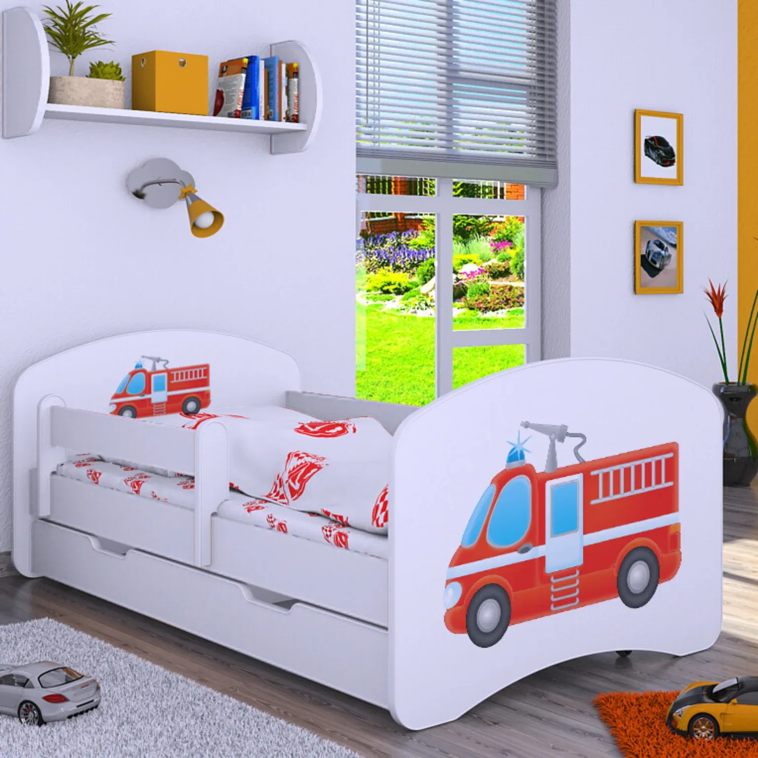 Drveni dječji krevet Happy vatrogasno vozilo s ladicom – 160×80 - 544911013155