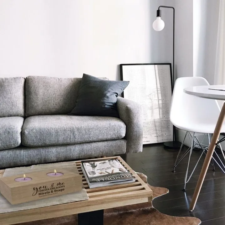 Ovaj drveni svijećnjak od punog prirodnog drveta dolazi u kompletu s lučicama pod nazivom “you & me”. Sami izaberite koliko lučica želite na svijećnjaku (jednu ili dvije). Ovaj drveni svijećnjak je savršen za bilo koji stol u kućanstvu. Personalizirajte s imenima sretnog para koje ćemo stručno gravirati. Ovo je izvrstan poklon za voljene.