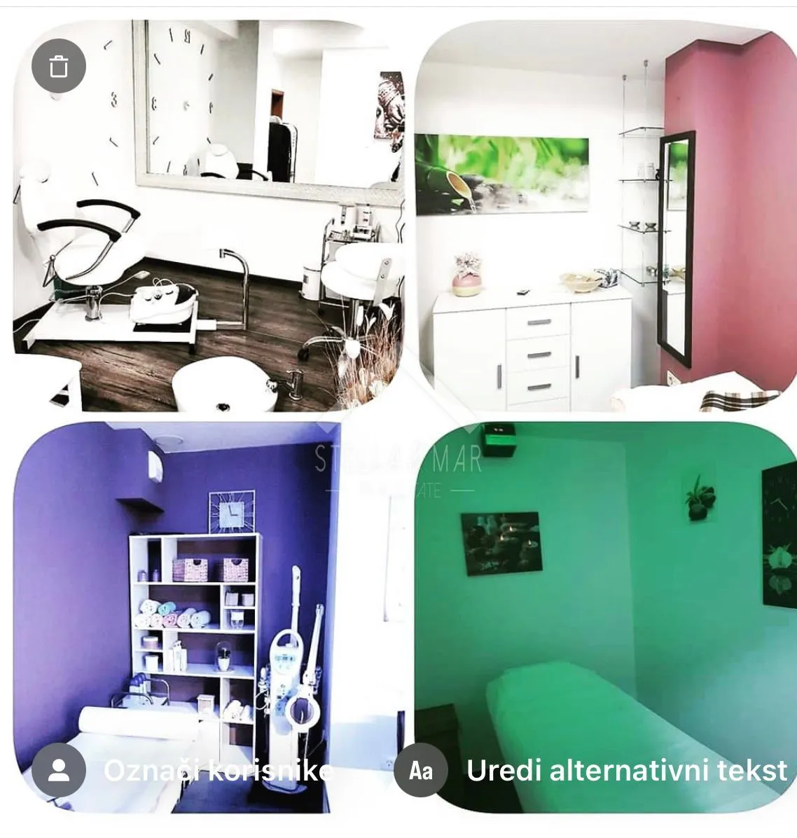 Prostor je raspodijeljen na prizemni dio u kojem se nalazi frizerski salon (salon, te sanitarni čvor sa praonicom ili tehničkom sobom, kupaonica) te donju etažu u kojem je trenutno kozmetički salon.