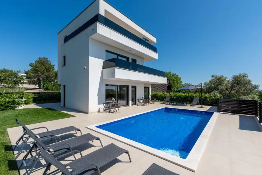 Moderna vila s pogledom na more i bazenom – 1 km od plaže Smještena na mirnoj lokaciji, svega 1 km od uređenih plaža, ova impresivna moderna vila pruža savršen spoj luksuza, udobnosti i prirodnog okruženja. S ukupno 270 m² stambenog prostora raspoređenog na tri etaže, na prostranoj parceli od 1.035 m², vila nudi potpunu privatnost i spektakularan panoramski pogled na more. U prizemlju se nalazi elegantno predsoblje koje vodi u prostranu kuhinju s blagovaonicom i moderno uređen dnevni boravak. Iz dnevnog dijela izlazi se na veliku terasu i sunčalište uz bazen, idealno mjesto za opuštanje i uživanje u mediteranskom ambijentu. Na istoj etaži smješteni su i gostinjski WC, potpuno opremljena kupaonica te tehnička prostorija odnosno kotlovnica. Na prvom katu nalaze se tri prostrane spavaće sobe, svaka s vlastitom kupaonicom, čime je osigurana maksimalna udobnost i privatnost. Sve sobe imaju izlaz na terasu s prekrasnim pogledom na more, a velike staklene stijene omogućuju obilje prirodnog svjetla i osjećaj prozračnosti. Na drugom katu smještena je dodatna spavaća soba s vlastitom kupaonicom, prostorija predviđena za saunu te prostrana terasa s otvorenim panoramskim pogledom na more, savršena za potpuni odmor i uživanje u zalascima sunca. Okućnica vile pažljivo je uređena i obogaćena mediteranskim biljem, dok prostor oko bazena nudi idealne uvjete za sunčanje i druženje na otvorenom. Vila je građena vrhunskim materijalima te je opremljena modernim sustavima grijanja i hlađenja. Cijela kuća grije se putem podnog grijanja na dizalicu topline, što osigurava visoku energetsku učinkovitost i ugodan boravak tijekom cijele godine. Ova luksuzna nekretnina idealan je izbor za obiteljski život ili kao investicija za turistički najam na atraktivnoj lokaciji u blizini mora, a istovremeno dovoljno udaljenoj od gradske vreve.
