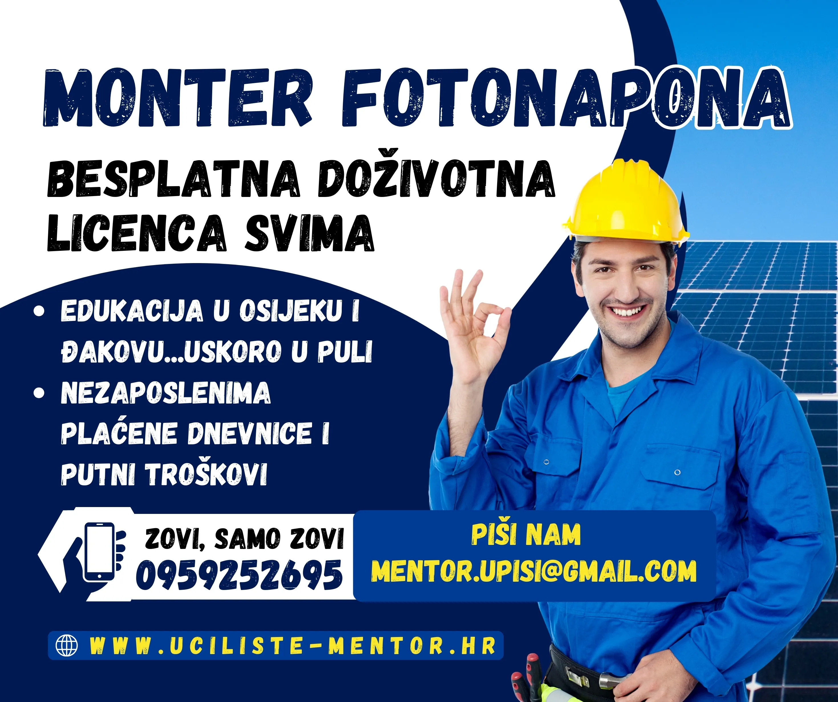 Nakon izobrazbe i položenog ispita, stjećete doživotnu licencu Monter fotonaponskih sustava.