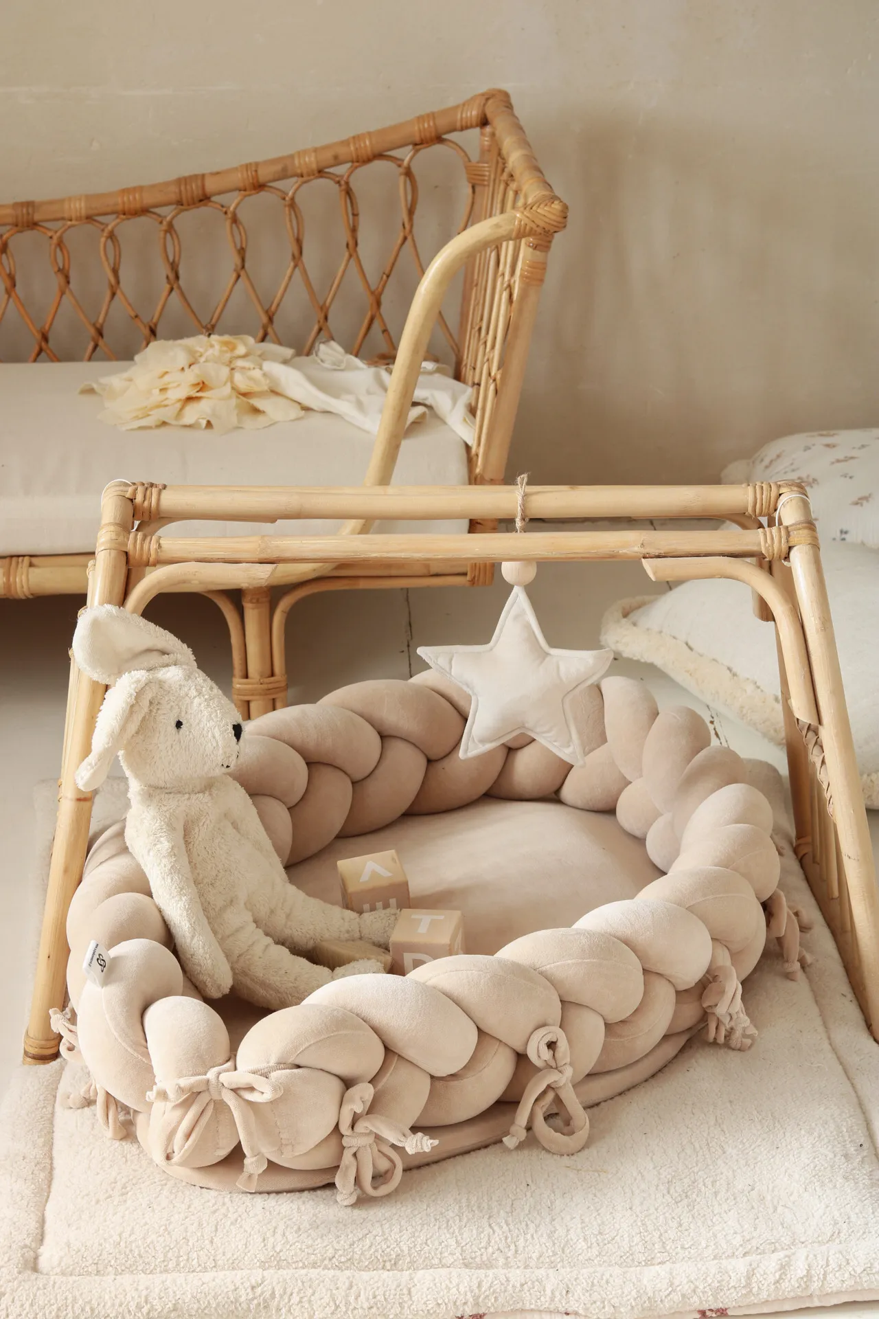Gnijezdo pletenica nije samo ograda za krevetić, već i savršena mekana podloga za igru. Zahvaljujući svojoj fleksibilnosti, može se prilagoditi različitim oblicima, čineći ga pogodnim za razne vrste dječjih ležajeva i prostora za igru. Pletenica se može jednostavno odvojiti od podloge pomoću vezica, omogućujući vam da je koristite kao samostalnu zaštitu ili mekani jastuk. Ovo čini gnijezdo vrlo praktičnim i funkcionalnim za svakodnevnu uporabu.