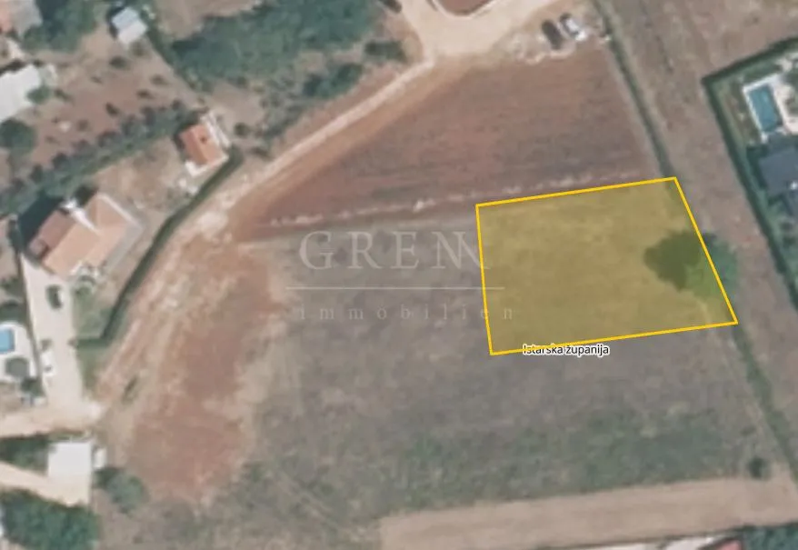 Građevinsko zemljište udaljeno 6 km od mora i 8 km od grada Poreča. Zemljište ima pravomočnu građevinsku dozvolu za prizemnicu od 120 m2 i bazen. Kuća se sastoji od 3 spavaće sobe i 3 kupatila kao što se vidi u tlocrtu. Svi priključci u blizini parcele.