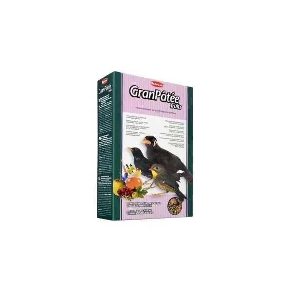 GranPâtée fruits. POTPUNA HRANA ZA PTICE KOJE SE HRANE BILJOM HRANOM, INSEKTOJEDE i druge ptice (indijskog kosa, kos, drozd cikelj, čvorak, poljska ševa, drozd bravenjak, japanski slavuj, mali drozd, itd.). Potpuna hrana sa voćem i medom te dodatkom vitamina i aminokiselina. SASTAV: žitarice, nusproizvodi biljnog porijekla, ekstrakt biljnih bjelančevina, ulja i masti, voće (grožđe 4%, smokva 1,5%, jabukom 0,5%, plodovi smreke 0,5%), mineralne tvari, šećeri (med 1%), sjemena, sorbitol. ADITIVI PO KG: A vitamin 5600 IJ, D3 vitamin 1300 IJ, E vitamin (alfa tokoferol acetat) 20 mg, L-lizin (3.2.2) 6000 mg, metionin (3.1.6) 3800 mg, pentahidratna modra galica (Cu) 59 mg, željezni karbonat (Fe) 50 mg, cinkov oksid (Zn) 75 mg, manganov oksid (Mn) 78 mg. Antioksidansi. Veziva: bentonit-montmorilonit 17 g. NAČIN UPORABE: usipati u posudicu i ostaviti na slobodno raspolaganje ptičice. Davati svaki dan svježu i čistu vodu. Čuvati na svježem i suhom mjestu. PAKIRANO U ZAŠTIĆENOJ ATMOSFERI
