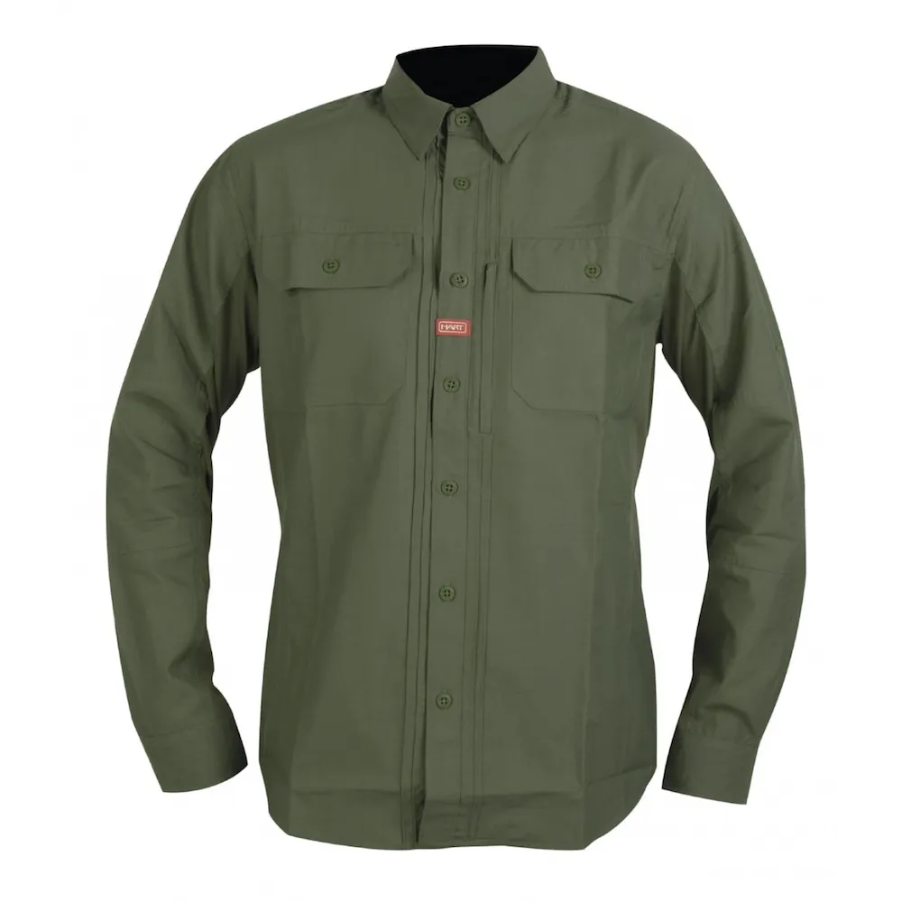 Hart AIA zelena košulja za lov i aktivnosti na otvorenom, za blage i vruće vremenske uvjete. Otvor za ventilaciju na stražnjoj strani. Mrežasti dijelovi na rukama, ispod pazuha i stražnjoj strani za poboljšanu ventilaciju. Tri džepa na prsima: dva na gumbe i jedan na patentni zatvarač. Skriveni čistač naočala ispod prednjeg razreza. Remen za podešavanje duljine rukava. Težina tkanine: 150 g/m². YKK patentni zatvarač, pouzdan i visoke kvalitete.