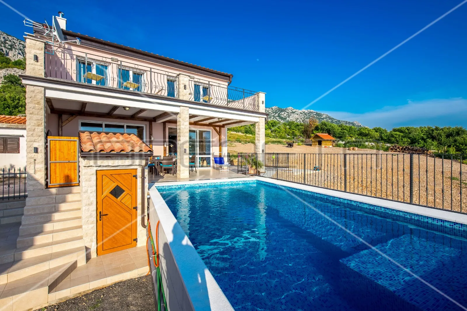 Impresivna i izolirana kuća s bazenom u Parku prirode Velebit Impresivna i izolirana kuća s bazenom u Parku prirode Velebit, 232 m2 Nevjerojatna rijetkost je pronaći ovakvo nekretninu i da bude ponuđeno za kupnju. Ova prostrana novoizgrađena kuća smještena na izdvojenoj lokaciji i mirnom, odnosno zelenom području iznad mjesta Jablanac. Ova mikrolokacija obećava otvorene poglede na Jadransko more, otoke Rab, Pag, Lošinj, te planinski lanac Velebit. Kuća se nalazi na terenu površine 528 m2, a proteže se na 2 etaže, a pokraj se nalazi pomoćni objekt kao samostalna uređena smještajna jedinica. Prizemlje se sastoji od udobne kuhinje s blagovaonicom iz koje se izlazi na prostranu natkrivenu terasu s pogledom prema bazenu i moru. Iz blagovaonice se ulazi u veliki dnevni boravak uređen s kamenom i drvenim gredama s velikim kaminom. Dodatno, tu se nalazi i ostava, garderoba, kupaonica s tuš kabinom, hodnik i sauna. Na prvom katu su dvije svijetle velike spavaće sobe, svaka s kupaonicom s hidromasažnom kadom. Obje sobe imaju izlaz na prostranu terasu s prekrasnim otvorenim pogledom. Pomoćni objekt, kao dodatni sadržaj, opremljen i odvojen u samostalnu jedinicu sastoji se od prostora za dnevni boravak i spavanje, kupaonicom sa tuš kabinom, natkrivenom terasu te prostora za pranje i sušenje rublja. Namještaj u kući i pomoćnoj zgradi opremljen je pravim hrastovim drvetom, a kuhinja i blagovaonica od drva trešnje. Kuća ima napajanje vodom iz vlastitih spremnika koji imaju zapremninu od 90m3. Posebno se treba istaknuti kako se ova nekretnina se nalazi u „Parku prirode sjeverni Velebit“ te samim time je zaštićeno područje od novih gradnji. Grijanje i hlađenje tijekom godine osigurava sedam klima uređaja (sa dvije vanjske jedinice) postavljenih po cijelom objektu, te veliki kamin smješten u dnevnom boravku. Kuća obložena toplinsko zvučnom izolacijom od 10 cm na koju je navučena Baumit fasada silikat, te je kuća jako dobro izolirana od topline I hladnoće. Prostrana uređena okućnica, sunčalište, bazen od 32m2 i mirno susjedstvo s prirodnim okruženjem planine čine ovu kuću idealnom za odmor i bijeg od brzog života. Moguće je parkirati ispod natkrivenog parkinga koji je predviđen za 2 do 3 auta, ali prostora ima i za više automobila. Postoji mogućnost kupnje i susjednih objekata, te bi se na taj način oformila veća cjelina, a sukladno tome i veća intima. Susjedna naselja: Karlobag, Stinica, Cesarica Susjedni gradovi/otoci: Senj, otok Rab, otok Pag USLUGA KREDITNOG POSREDOVANJA: Opereta ekspert pruža besplatnu uslugu kreditnog posredovanja, uspoređujući ponude više banaka na jednom mjestu. Naš tim objašnjava sve opcije i vodi vas kroz cijeli proces – od konzultacija do isplate kredita, kako biste donijeli informiranu financijsku odluku i uštedjeli vrijeme.