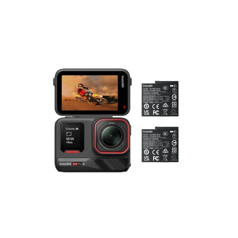 Akcijska kamera visoke klase namijenjena snimanju avanturističkih videa, vloga, sportskih snimaka i putovanja; Kamera kombinira veliki 1/1.3″ senzor sa Leica SUMMARIT objektivom, naprednim AI i procesorskim komponentama te bogatim setom video i foto funkcija; Fokus je na vrhunskoj kvaliteti slike, stabilizaciji, izdržljivosti i intuitivnom upravljanju; 8K video; Active HDR za bolje detalje u svijetlim i tamnim dijelovima; FlowState stabilizacija + 360° Horizon Lock za glatke snimke; Pre-Recording funkcija (do 120 s) – snima prije nego pritisneš REC tipku; Pause/Resume snimanje i Live Snapshot; 50 MP fotografije; Gesture & Voice Control – hands-free upravljanje; Vodootporna do 12 m bez kućišta; Dvije baterije: 2 × 1800 mAh – do oko 180 min snimanja; AI Highlights Assistant – automatsko generiranje kratkih video isječaka; U paketu: Insta360 Ace Pro 2 akcijska kamera, 2 × 1800 mAh baterije, Standardni nosač, Wind Guard (za zaštitu od vjetra), USB-C kabel, Mikrofon kapica