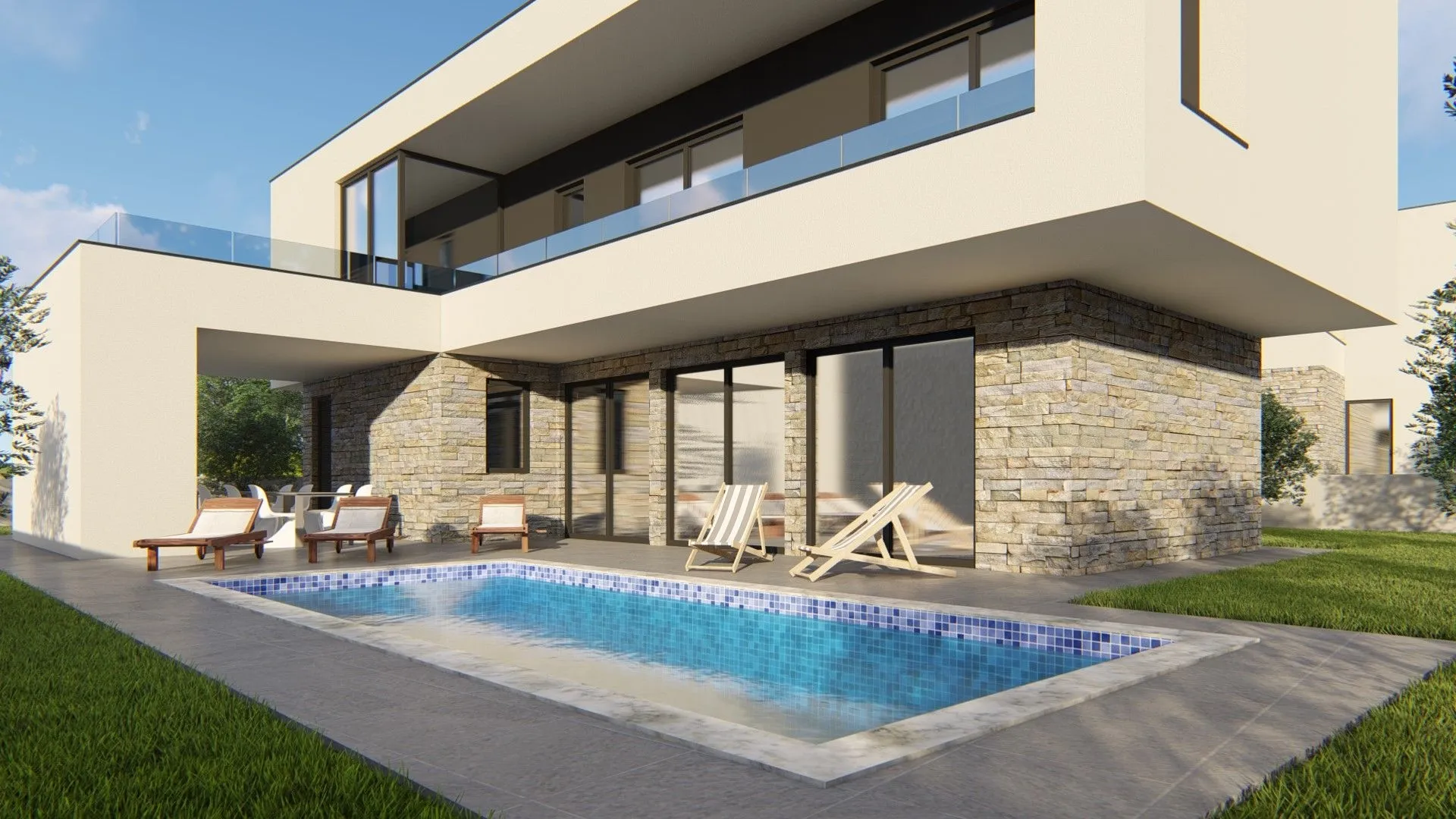 Prodaje se Vila za odmor s bazenom - 2 km od mora Nekretnina se nalazi na predivnoj lokaciji okružena prirodom u manjem mjestašcu 2 kilometra od predivnih plaža. Sastoji se od prizemlja i prvog kata. Na prizemlju se nalazi natkriveni ulaz, hodnik, dnevni boravak s kuhinjom i blagavaonom s izlazom na vanjsku terasu i bazen, kupatilo, te dvije antkrivene terase ukupne stambene površine 91 m2. Unutarnje stepenice vode nas na 1. kat gdje se nalaze 3 spavaće sobe s 3 kupatila, hodnik, te natkrivena i nenatkrivena terasa ukupne stambene površine 84 m2. Smještena je na parceli površine 1000 m2 sa uređenom zelenom površinom, bazenom površine 21 m2 te dva parkirna mjesta. Kuća je u izgradnji te kupac može birati sustav grijanja i hlađenja i kompletno uređenje interijera. Poštovani klijenti, agencijska provizija naplaćuje se u skladu s Općim uvjetima poslovanja: www.dux-nekretnine.hr/opci-uvjeti-poslovanja ID KOD AGENCIJE: 21369 Ana Glavaš Agent s licencom Mob: +385 97 757 1657 Tel: +385 99 640 8438 E-mail: ana@dux-istra.com www.dux-istra.com