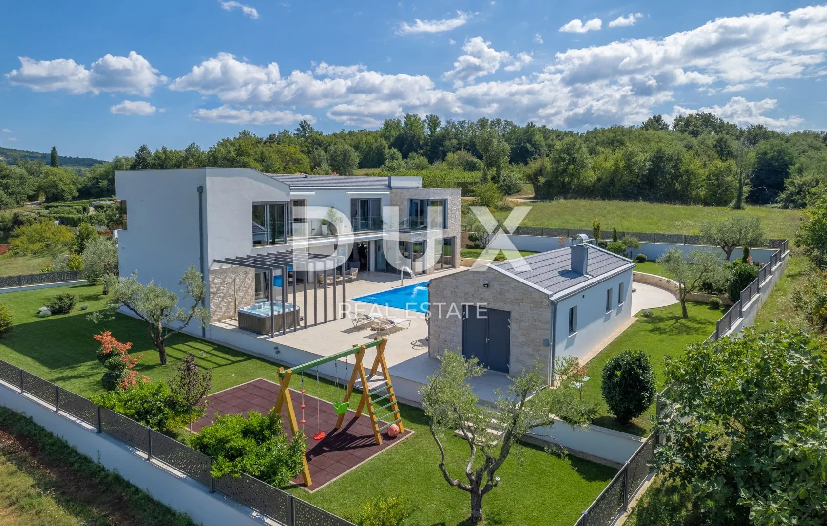 ISTRA, MOTOVUN - Impresivna luksuzna vila Motovun je popularna turistička destinacija koja je danas na glasu kao centar hedonista iz cijeloga svijeta. Drevni istarski akropolski gradić smješten na vrhu 277 metara visokog brijega koji dominira dolinom rijeke Mirne jedan je od najljepših starih gradova na Mediteranu. Do njega vodi najduže istarsko stepenište s 1052 stepenica. Motovun je grad-spomenik na UNESCO World Heritage pristupnoj listi. Ono što Motovun i njegovu općinu, koja se prostire na površini od 33,58 km², čini posebnima su biološke raznolikosti, bogat biljni svijet i osobita mikroklimatska obilježja. Zbog specifičnih geomorfoloških karakteristika sa brojnim brežuljcima pažnju plijeni prirodnim ljepotama i nezaboravnim panoramskim pogledima koji ispunjuju dušu. Nedaleko Motovuna, prodaje se impresivna luksuzna vila. Vila se nalazi na mirnoj i tihoj lokaciji te predstavlja savršenu kombinaciju modernog interijera i mirnog krajolika. Okružena idiličnim krajobrazom, izgrađena je 2022. godine u suvremenom stilu, a njezina posebnost je luksuzni interijer koji ostavlja bez daha. Ova izuzetno uređena vila impozantne površine od 447 m² podijeljena je na prizemlje i kat. Prizemlje čine open space prostor s kuhinjom, blagovaonicom i dnevnim boravkom, spavaća soba s vlastitom kupaonicom, ulazni prostor sa garderobnim spremištem, toalet, soba za tehniku i stubište. U sklopu prizemne etaže nalazi se prostorija za zabavu i opuštanje s finskom saunom i tušem s zasebnim ulazom. Kako bi wellness kutak bio upotpunjen ispred prostorije nalazi se natkrivena hidromasažna kada. Na katu je smještena praonica rublja, dvije terase i četiri spavaće sobe s vlastitim kupaonicama. Sve spavaće sobe su uređene slično, a karakterizira ih jednostavnost i bijelina te izlaz na terasu s koje se pruža velikodušan pogled na idilične brežuljke. Interijer vile izveden je na moderan način, minimalističkim čistim formama i dizajnom u toplim tonovima i visokokvalitetnim materijalima. Velik dio kuće čine elegantne staklene stijene koje omogućuju puno prirodnog svjetla koje su suptilna granica između interijera i eksterijera. Sva stolarija i staklene stijene izvedene su od AluK aluminijskih profila, ostakljene troslojnim toniranim staklom sa screen rolo sjenilima i komarnicima. Na terasama su postavljene i tende sa električnim sustavom otvaranja i zatvaranja sa senzorom u slučaju nevremena. Opremljena je Daikin klima uređajima, toplinskom pumpom, video nadzorom i alarmnim sustavom. Ograđena i elegantno i impresivno je uređena i okućnica idilične atmosfere u kojoj se smjenjuju tišina i zvukovi prirode. Centralnu zonu istinskog opuštanja i mira svakako zauzima bazen površine 60 m² sa sunčalištem. U prostoriji za održavanje bazena nalazi se pumpa za dogrijavanje vode i pumpa sa tri trimera, kako bi se automatski moglo održavati klor i PH faktor vode u bazenu, a tu je i robot za čišćenje samog bazena. Uz bazen se smještena natkrivena ljetna kuhinja s kaminom i vanjskom blagovaonom i ostavom i dječje igralište sa gumenom podlogom. Luksuz i elegancija obavijeni modernim ruhom i arhitekturom kombinirajući ljepotu istarske zemlje ključni su elementi ove vile koja je idealna prilika za obiteljski život, odmor i opuštanje ili kao investicija za iznajmljivanje u turističke svrhe. Prodavatelj predmetne nekretnine je pravna osoba. Poštovani klijenti, agencijska provizija naplaćuje se u skladu s Općim uvjetima poslovanja www.dux-nekretnine.hr/opci-uvjeti-poslovanja ID KOD AGENCIJE: 26452 Iva Zajc Agent s licencom Mob: +385 92 235 9472 Tel: +385 99 640 8438 E-mail: iva@dux-istra.com www.dux-istra.com