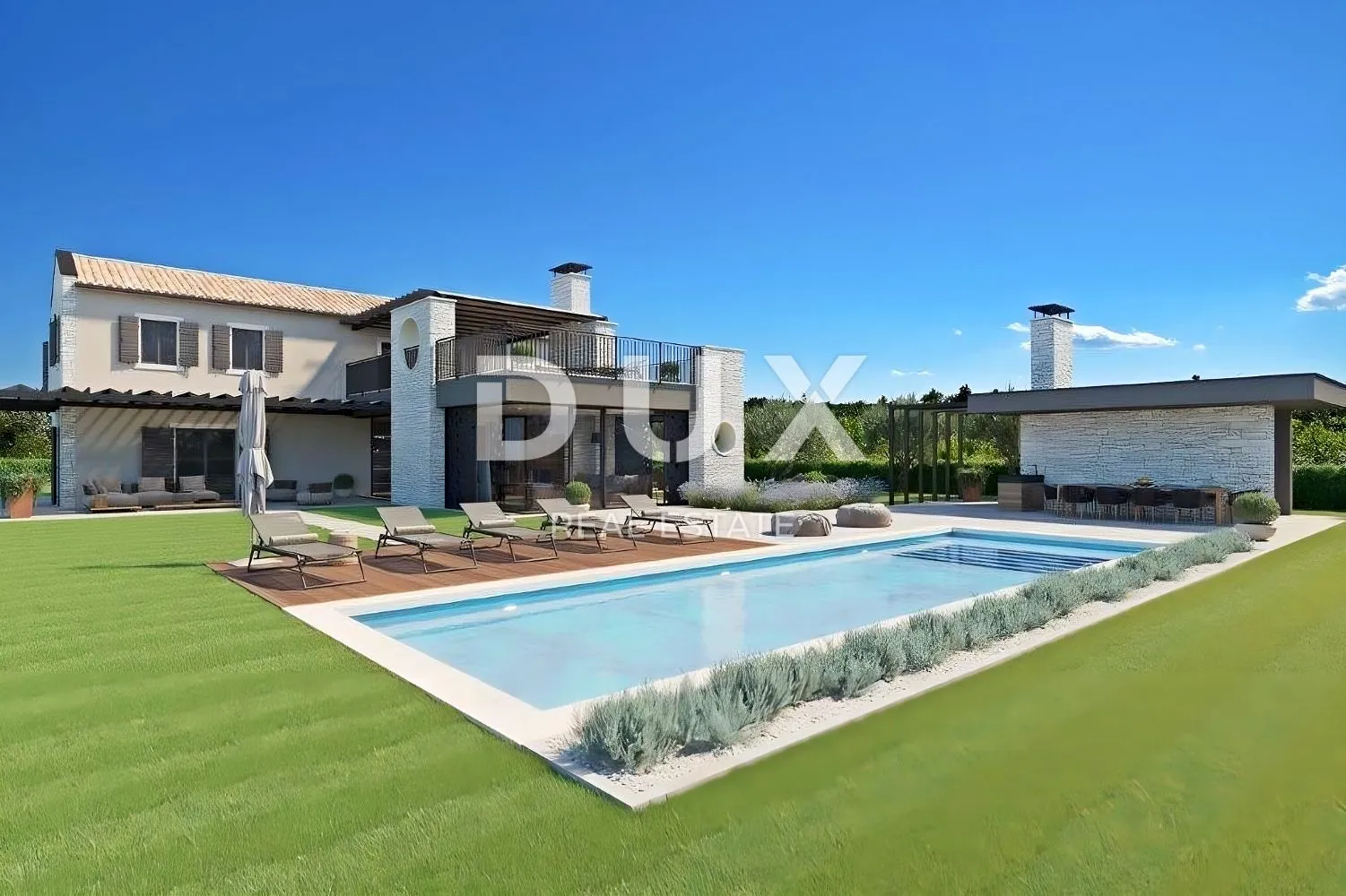 ISTRA, POREČ- Ekskluzivna vila moderno rustikalnog dizajna Okupan ugodnom mediteranskom klimom, smješten u srcu zapadne istarske obale, antički gradić Poreč i njegovo priobalje sačuvanih prirodnih ljepota, uređenih parkova, borovih i hrastovih šumaraka koji sežu do samoga mora, duž kojeg se izmjenjuju čisto more, plaže, zaljevi i otoci rasprostire se na području od 139 km² a sastoji se od 58 naselja. S identitetom urbanog primorskog grada, Poreč je grad kulture, sporta, zabave, grad turizma i istinske gostoljubivost. Jedan od najatraktivnijih gradova hrvatskog turizma koji na jedinstven način spaja prirodne ljepote Istre, bogato kulturno-povijesno naslijeđe i najmodernjie pogodnosti vrhunske turističke destinacije. Sklad starogradske jezgre koja je spomenik kulture s jednim od najpoznatijih istarskih kulturnih spomenika, Eufrazijevom bazilikom koja se nalazi na UNESCO-voj listi svjetske baštine i najuređenijih i najbolje opremljenih turističkih naselja na Jadranu formira mozaik nezaboravnih iskustava. Poreč je i grad koji je mnogo više od ljetne destinacije sunca i mora. Poreč je grad po mjeri čovjeka. Grad u kojem postoji stalni impuls da uvjeti života budu bolji, a napredak u raznim sferama veći. Grad koji je ugodno, sigurno i kvalitetno uređeno mjesto za život gdje svatko može pronaći svoje mjesto, grad bez prireza s visokom socijalnom osjetljivošću za sve generacije. U okolici grada Poreča, na prodaju je ekskluzivna vila moderno rustikalnog dizajna. Smještena u idiličnom naselju, projektirana je poštujući struku, zakonsku regulativu i prostornoplansku dokumentaciju te je građena prema najvišim standardima za stambenu izgradnju. Svojom pitomom arhitekturom ne remeti okoliš već stvara sinergiju prirodnog okruženja, tradicionalne istarske arhitekture i moderanog dizajna. Oblikovna jednostavnost rezultirala je stvaranje kompaktnog tlocrta i ugodnog prozračnog prostora. Koncipirana je kao jedna stambena jedinica koja se proteže na dvije etaže modernog interijera koji odiše elegancijom i jednostavnošću te pruža visoku razinu komfora. Prizemlje se sastoji od otvorenog koncepta prostora koji ujedinjuje dnevni boravak, blagovaonicu i kuhinju s izlazom na terasu natkrivenu pergolom. Tlocrt prizemlja nadopunjuju spavaća soba s vlastitom kupaonicom, gostinjski toalet, praonica rublja, prostorija za tehniku, spremište i hodnik. Na katu se nalaze tri spavaće sobe s vlastitim kupaonicama a glavna spavaća soba ima pristup vlastitom balkonu. Predsoblje ima pristup djelomično natkrivenoj prostranoj terasi površine 78 m² s hidromasažnom kadom i pogledom na more i okolicu. Okućnica je u potpunosti ograđena i elegantno uređena travnatim površinama i mediteranskim biljem. Centralno mjesto zauzima bazen površine 50 m² sa slanom vodom. Okućnica sadrži i ljetnu kuhinju površine 42 m² s toaletom i natkriveni parking sa spremištem površine 60 m². Ova savršeno ukomponirana nekretnina je izuzetna prilika za komforan obiteljski život kao i za investicijsko ulaganje u turistički posao u iznajmljivanju. Poštovani klijenti, agencijska provizija naplaćuje se u skladu s Općim uvjetima poslovanja: www.dux-nekretnine.hr/opci-uvjeti-poslovanja ID KOD AGENCIJE: 10680 Iva Zajc Agent s licencom Mob: +385 92 235 9472 Tel: +385 99 640 8438 E-mail: iva@dux-istra.com www.dux-istra.com