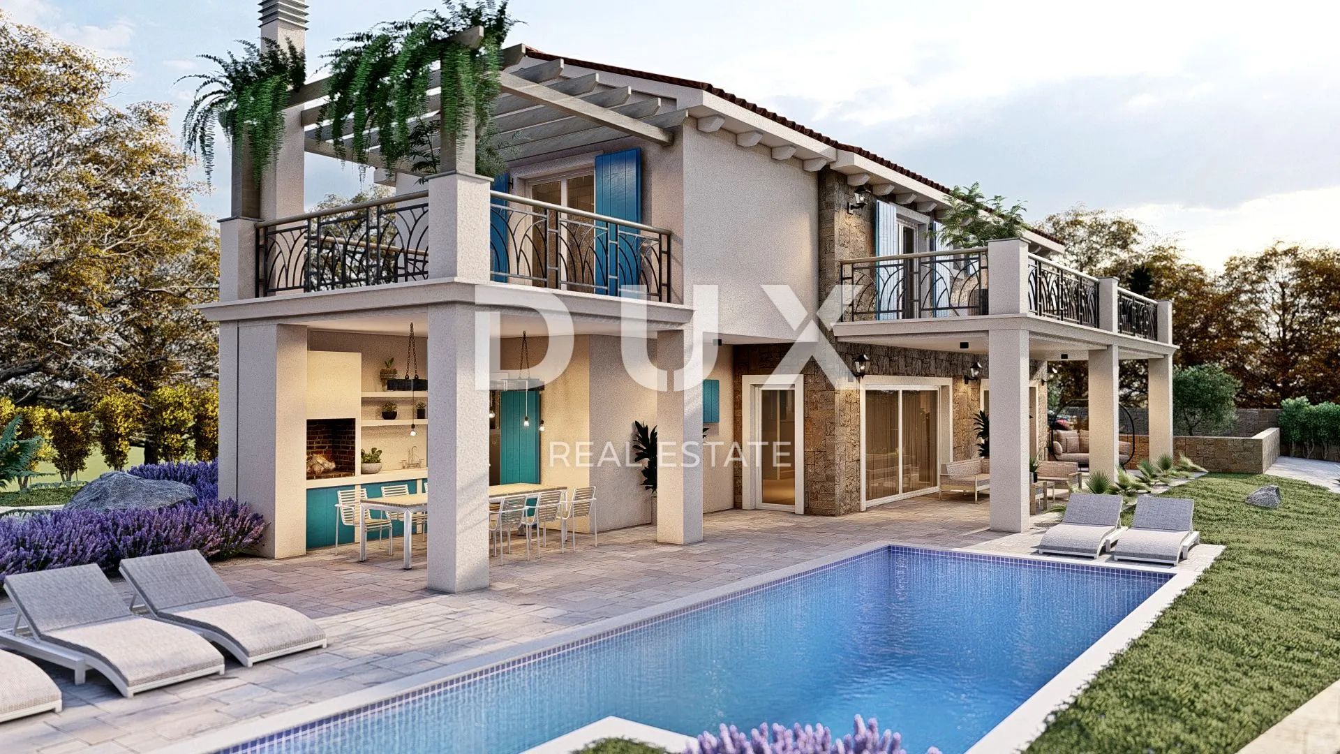 ISTRA, RABAC - Mediteranska kuća s bazenom i panoramskim pogledom na more Na jugoistočnoj obali Istre na mjestu gdje se zeleni brežuljci sastaju s morem, tamo gdje se sjedinjuju priroda i baština, na samo četiri kilometara udaljenosti nalaze se dva gradića slične veličine s različitim ali međusobno nadopunjujućim karakterom - Labin i Rabac. Rabac, zbog bijelih šljunčanih plaža, bogatog mediteranskog raslinja i kristalno čistog i bistrog mora, nazvan je biserom Kvarnera. Nekad malo ribarsko mjesto, danas je Rabac atraktivno turističko odredište koje u mreži živopisnih uličica krije obilje kulturnih događanja. Zeleno okruženje Rapca i pitoreskno zaleđe poziva na avanturu, istraživanje i rekreaciju tijekom cijele godine. Nedaleko Rapca i Labina, na prodaju je mediteranska kuća s bazenom i panoramskim pogledom na more. Nalazi se u pitomom naselju čija lokacija nudi autentičan doživljaj malog istarskog mjesta, intimnost i rasterećenost od svakog užurbanog napora i buke a ujedno blizinu mora i urbanih sadržaja. Nekretnina predstavlja sklad prostora, potreba, funkcija, konstrukcije i ljepote a karakterizira ju spoj tradicionalnog i modernog, kvaliteta gradnje i prostorna organizacija interijera. Komforna kuća djelomično obložena kamenom s rustikalnim plavim škurama se oblikovno i koloristički uklopa u naselje i krajolik a proteže se kroz dvije etaže funkcionalnog tlocrta. Prizemlje se sastoji od prostora otvorenog koncepta koji ujedinjuje kuhinju, blagovaonicu i dnevni boravak s izlazom na natkrivenu terasu koja sadrži ljetnu kuhinju, gostinjskoh toaleta, spremišta, ostave i tehničke prostorije. Kat se sastoji od predsoblja, tri spavaće sobe s vlastitim kupaonicama i dvije terase. Okućnica je ograđena i ambijentalno i hortikulturno uređena a potpuni sklad pruža bazen sa sunčalištem. Izvanredna lokacija te prostorna organizacija interijera i eksterijera ove nekretnine pruža priliku za komforan obiteljski život ili investicijsko ulaganje u turistički posao u iznajmljivanju. Planirani rok završetka radova i primopredaja nekretnine predviđen je početkom 2026. godine. Navedena cijena nekretnine odnosi se na konačan stupanj izvedenosti bez namještaja što omogućuje finalno uređenje prema vlastitim željama i preferencijama. Prodavatelj predmetne nekretnine je pravna osoba te PDV nije uključen u navedenu cijenu. Poštovani klijenti, agencijska provizija naplaćuje se u skladu s Općim uvjetima poslovanja: www.dux-nekretnine.hr/opci-uvjeti-poslovanja ID KOD AGENCIJE: 38657 Iva Zajc Agent s licencom Mob: +385 92 235 9472 Tel: +385 99 640 8438 E-mail: iva@dux-istra.com www.dux-istra.com