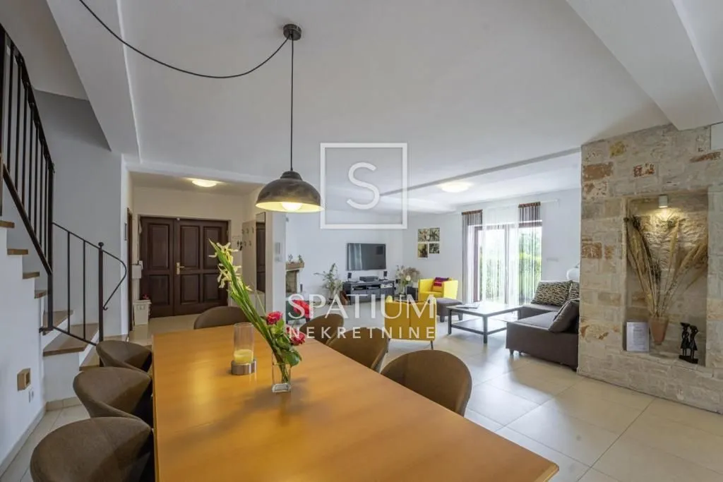 ISTRA, u ponudu smo dobili vilu površine 216 m2. U prizemlju se nalazi open space koncept s kuhinjom, blagovaonom i dnevnim boravkom te kaminom. Iz dnevnog dijela izlazi se na natkrivenu terasu na kojem se nalazi bazen na prostranom sunčalištu na okućnici od 1148 m2. U nastavku terase je gostinjska soba s kupaonom. Na prvom katu vile su dvije prostrane sobe s vlastitim kupaonicama iz kojih se izlazi na lijepu terasu. Vila je uređena u autohtonom stilu. Pruža maksimalan komfor, na okućnici su dva natkrivena parkirna mjesta i dva nenatkrivena. Vila ima etažno podno grijanje i klime. Ova nekretnina se nalazi u mirnom mjestu okružena prirodom. Do prvih plaža udaljena je svega 20 minuta vožnje te je kao takva idealna za one koji bi se bavili turističkom djelatnošću kao i za miran i dugoročan život. Tinjan je malo pitoreskno naselje smješteno u središtu Istre, regije u Hrvatskoj. Nalazi se u blizini poznatih istarskih gradova poput Pule, Rovinja i Pazina. Tinjan je poznat po svojoj ruralnoj atmosferi, okružen zelenim poljima, vinogradima i maslinicima. Ovaj cijeli kraj obiluje simbolima poput kažuna, suhozida, folklorne i graditeljske baštine te vrhunskih gastronomskih specijaliteta. Ovo malo mjesto ima bogatu povijest i kulturnu baštinu. Poznato je po tradicionalnoj istarskoj kuhinji, posebno po proizvodnji istarskih kobasica i pršuta. Svake godine u Tinjanu se održava manifestacija pod nazivom "Sajam kobasica" koja privlači posjetitelje iz cijele regije. Tinjan je također poznat po svojim prekrasnim ruralnim krajolicima i mogućnostima za aktivnosti na otvorenom. Mnogi posjetitelji uživaju u šetnjama po prirodi, biciklizmu i istraživanju okolnih sela i vinarija. Uz svoju prirodnu ljepotu, Tinjan također nudi miran i opuštajući odmor daleko od gužve gradskog života. Posjetitelji mogu istraživati uske uličice s tradicionalnim kamenim kućama, posjetiti lokalne trgovine i restorane te doživjeti autentičnu istarsku atmosferu. Ukratko, Tinjan je šarmantno istarsko selo s bogatom kulturom, tradicijom i prirodnim ljepotama, koje nudi miran i autentičan doživljaj Istre. Za sve ostale informacije obratite se s povjerenjem. Roberta Poropat agent s licencom +385 95 528 3152 roberta@spatium.hr Spatium nekretnine +385 51 452 479 info@spatium.hr ID KOD AGENCIJE: 2867 Roberta Poropat Agent s licencom Mob: +385 95 528 3152 Tel: +385 51 272 903 E-mail: roberta@spatium.hr www.spatium.hr