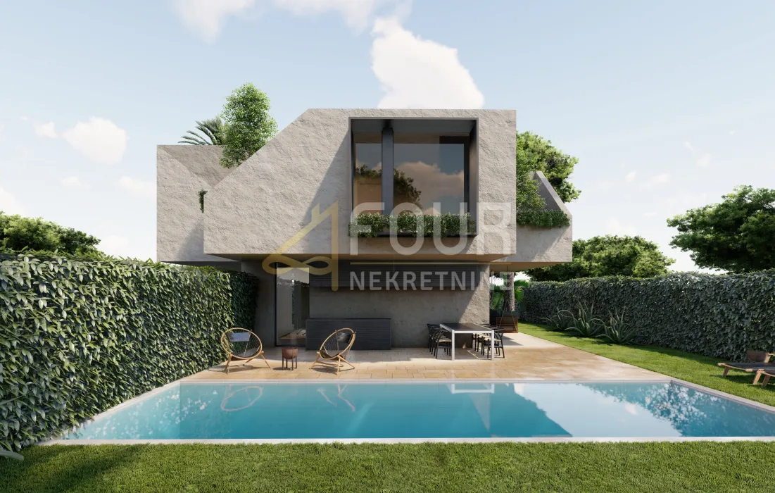 Moderna novogradnja – dvoetažni stan u naravi dvojna kuća s bazenom i okućnicom! Planirani završetak izgradnje je na proljeće 2026. godine. Ukupna stambena površina iznosi 162.12m2, dok okućnica obuhvaća otprilike 250m2. Vanjski prostor uključuje bazen površine 30 m2, više od 150 m2 uređenih zelenih površina te preko 70 m2 terasa i prostora za boravak na otvorenom. U sklopu okućnice nalaze se i dva parkirna mjesta (jedno natkriveno), spremište, sunčalište, natkriveni lounge prostor te zona predviđena za ljetnu kuhinju. U prizemlju se nalazi ulazna garderoba, veliki dnevni prostor otvorenog koncepta (kuhinja, blagovaonica i dnevni boravak) površine 45.17m2, spremište za namirnice (3.32m2), gostinjski toalet (2.30m2), unutarnje stubište (6.39m2) te dodatno spremište za alat i opremu (5.98m2) koji ima izravni ulaz s okućnice. Na katu se nalaze tri prostrane spavaće sobe, svaka s vlastitim garderobnim predprostorom, kupaonicom i privatnom terasom (površine od 5.29 do 5.75 m2). Dodatno, tu je i četvrta soba površine 11.29m2, trenutno upisana kao sportska soba, koja također ima svoju terasu i može se koristiti kao još jedna spavaća soba. Kuća će biti opremljena PVC i ALU stolarijom. Predviđeno je podno grijanje i hlađenje putem dizalice topline. Ova nekretnina predstavlja idealan izbor i kao investicija za turistički najam. Poštovani klijenti, agencijska provizija naplaćuje se u skladu s Općim uvjetima poslovanja. ID KOD AGENCIJE: K1618 Ana Rogulj Agent s licencom Mob: +385992001333 Tel: +385914944144, +38551619770 E-mail: anarogulj@four-nekretnine.hr www.four-nekretnine.hr