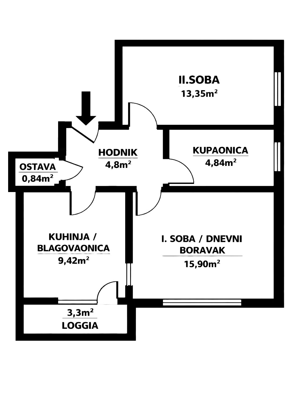 - HODNIKA - 4,8 m2 iz kojeg se ulazi u svaku prostoriju stana