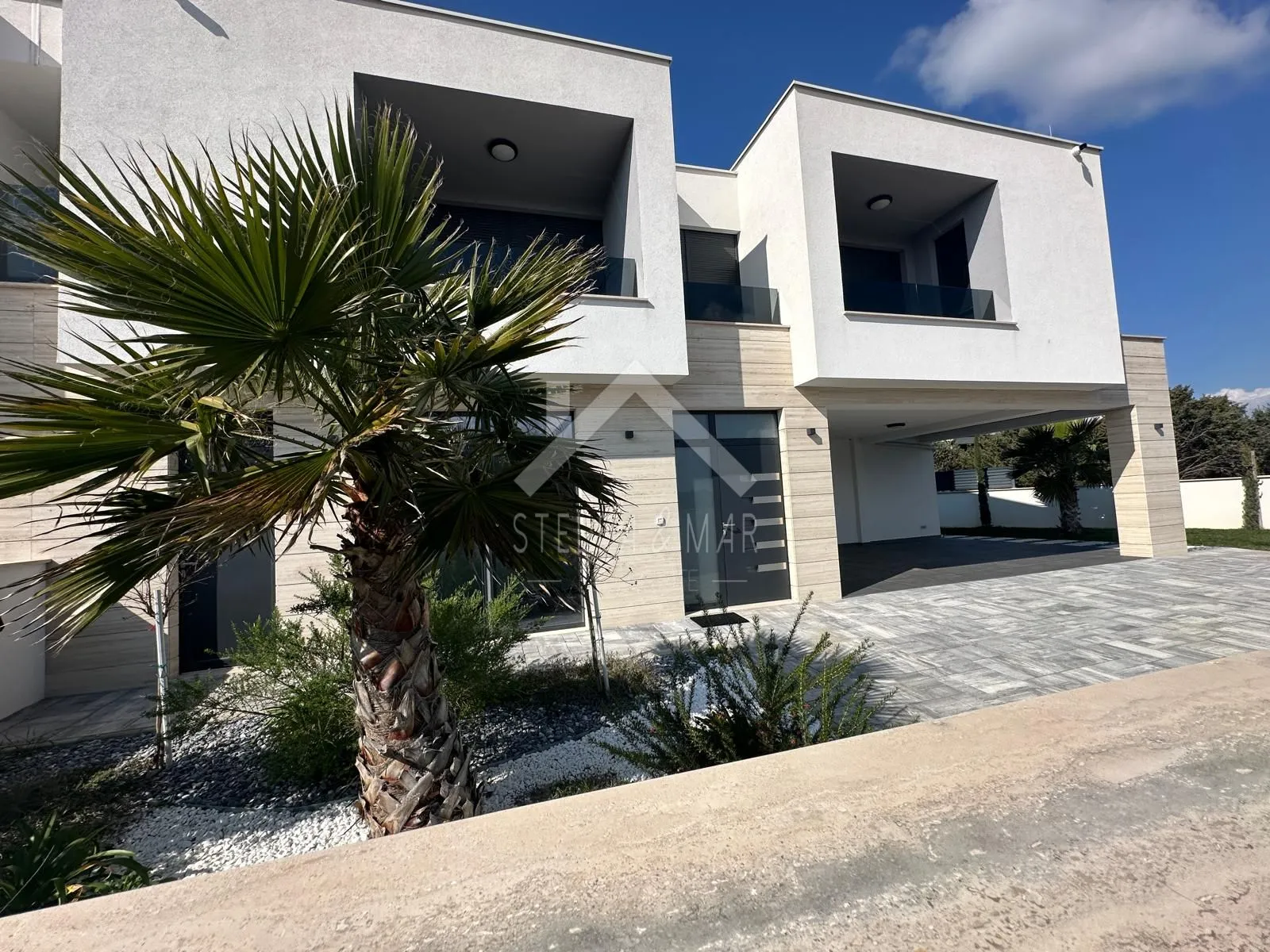 U dvorištu ima pomoćni objekt površine 8m2 te bazen 32m2. Sadrži dva natkrivena parkirna mjesta sa dostupnim utičnicama za struju pored. Također, moguće je u dvorištu dodatno parkirati 1-2 vozila. Uređeni travnjak, mirna okolina objekta. Urbane ville u susjedstvu, udaljenost do mora i prekrasne pješčane plaže cca 1,4km. U neposrednoj blizini (300)m nalazi se pekara i trgovina.