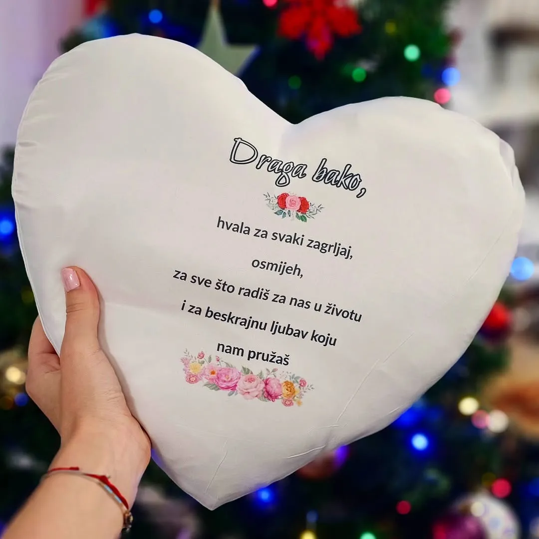 Mekani jastučić u obliku srca s nježnom porukom za baku.