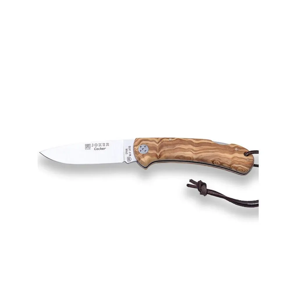Joker Cocker NO134 lovački preklopni nož sa oštricom od nehrđajućeg čelika dužine 9 cm i drvenom drškom sa kožnim užetom, idealan za nošenje prilikom lova, kampiranja, izletima u prirodi i ostale aktivnosti na otvorenom.