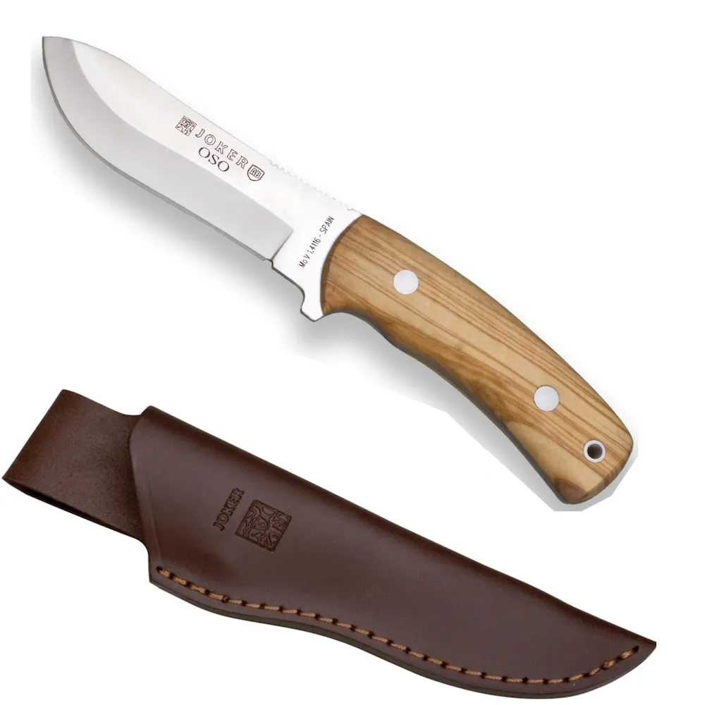 Lovački nož Joker CO54 savršen je sportski nož za vaše lovačke aktivnosti, jer je idealan i vrlo koristan za kampiranje, planinarenje, itd. Lovački nož Joker CO54 izrađen je od full tang oštrice od nehrđajućeg čelika Mova 1.4116 s duljinom oštrice od 12cm, širine oštrice 3,1cm i debljine 3,7mm. Dužina ručke je 11,5cm i izrađena je od maslinovog drveta. Nož Joker CO54 dolazi sa vrhunskom kožnom koricom u smeđoj boji.