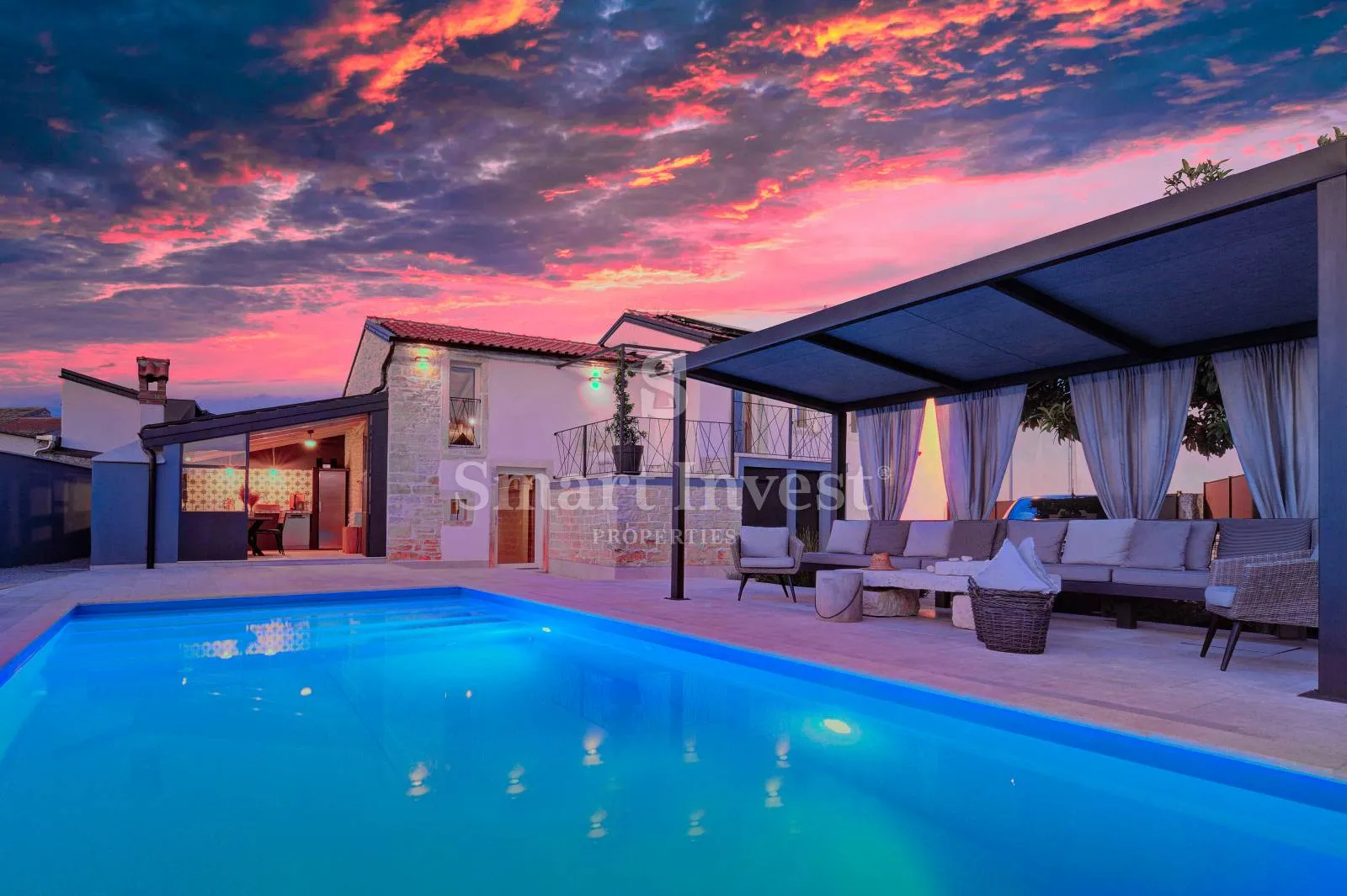 KANFANAR – okolica, prekrasna, kompletno renovirana i moderno opremljena kamena vila s grijanim bazenom na mirnoj lokaciji, 20 km udaljenoj od mora. Autohtona istarska vila je izgrađena 1921.godine, u potpunosti je adaptirana 2017. godine te predstavlja jedinstven spoj modernog unutarnjeg uređenja i autohtonog istarskog stila. Spoj kamena, drveta i modernih linija oduševit će svakoga. RASPORED I OPREMA Vila stambene površine 136 m2 smještena je na potpuno ograđenom zemljištu površine 335 m2, ima 3 spavaće sobe i 3 kupaonice. Prizemlje se sastoji od dnevnog boravka s kuhijom i blagovaonom, spavaće sobe s vlastitom kupaonom i izlazom na sunčalište bazena. U nastavku prizemlja se nalazi i ljetna kuhinja veličine 20 m2 koja je tik do sunčališta. Na katu su još dvije prostrane spavaće sobe s vlastitim kupaonicama, te prostrana terasa s koje možete gledati prekrasan krajolik ili magičan zalazak sunca. Vila je opremljena kvalitetnim namještajem i tehnikom, klima uređaji u svakoj sobi, podno grijanje u kupaonama, solarni sustav za grijanje potrošne vode. Okućnica nudi potpunu privatnost i mir, ograđena je sa automatskom kapijom na ulazu te uređena. Ovdje se nalazi bazen veličine 32 m2 sa slanom vodom koji je opremljen zasebnim sustavom solarnog grijanja. Do bazena nalazi se i natkriveni lounge prostor za odmor, uživanje i opuštanje u potpunom miru i tišini. LOKACIJA Vila je smještena u malom istarskom selu u okolici Kanfanara, udaljenost od grada Poreča, Vrsara i najbližih plaža 20 km, od Rovinja – 25 km. Za više informacija i razgled nazovite +385/99/320-0008 ID KOD AGENCIJE: 13117 Agencija Opatija Ovlašteni posrednik Mob: +385/99/320-0008 E-mail: office@smart-invest.hr www.smart-invest.hr