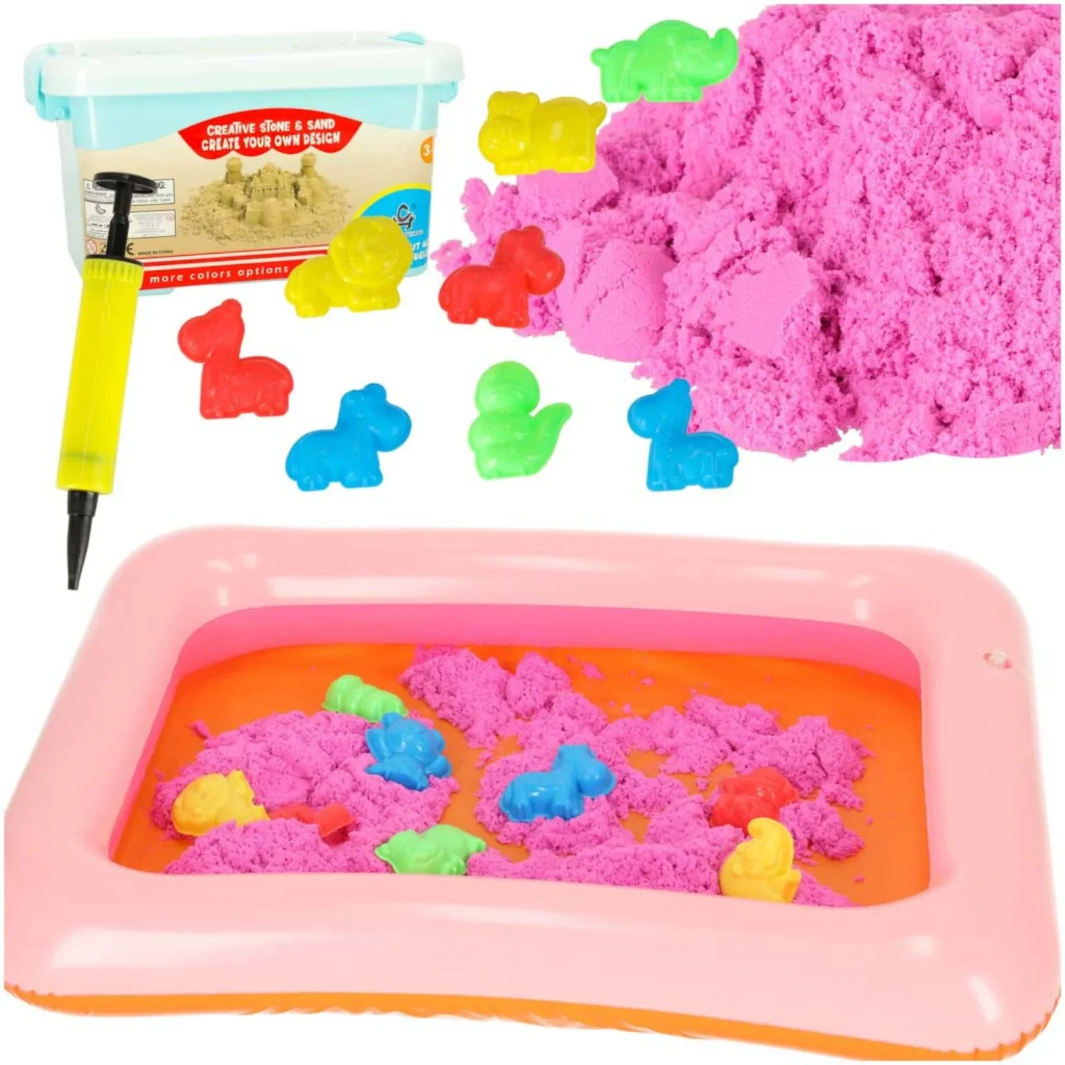 Kinetički pijesak je inovativna i neodoljiva igračka koja osigurava sate zabave i kreativnog izražavanja, a ujedno i potiče razvoj osjetila kod djece. Ovaj komplet sadrži sve potrebno za početak: 1 kg bež kinetičkog pijeska, osam plastičnih kalupa u obliku raznih životinja, ručnu pumpu te praktičnu napuhujuću sandbox podlogu koja sprječava širenje pijeska po prostoriji.