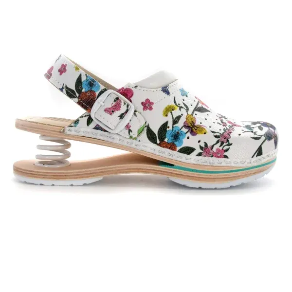 Biancomolina klompe s CERTIFIKATOM i oprugom u području pete potpuna su novost na našem tržištu i ručno su rađene. Ovaj model izrađen je po zahtjevu medicinskih djelatnika koji zahtijevaju certifikat stručnog testiranja. Ovaj artikl pripada kategoriji radno zaštitne obuće prema uredbi (EU) 2016/425 i u potpunosti je izrađen po standardu EN ISO 20347:2012 OB, SRC, E. Kožno gornjište je vrlo prostrano, prozračno i udobno zbog masirajućeg gel umetka u petnom djelu gazišta. Kopča pri vrhu gornjišta može se preklopiti tako da dodatno učvršćuje stopalo. Potplat je izrađen je od mekane i lagane gume koja svojom strukturom 100% garantira protukliznost čak i po mokroj ili masnoj podlozi. Klompe imaju posebno ugrađenu oprugu koja ublažava udarce i smanjuje pritisak na peti stoga su idealne za svakodnevno dugo hodanje i stajanje. Povoljno utječu na zglobove i leđa prilikom svakog koraka. Nošenjem BIANCOMOLINA klompi potiče se cirkulacija stopala i nogu, a kralježnica se oslobađa bilo kakvog bola što je idealno za dugo hodanje i stajanje. Ručno rađene klompe sa spužvastim jastukom, drvenim đonom, prirodnom goveđom kožom čine bitnu razliku između svega što ste ranije probali.