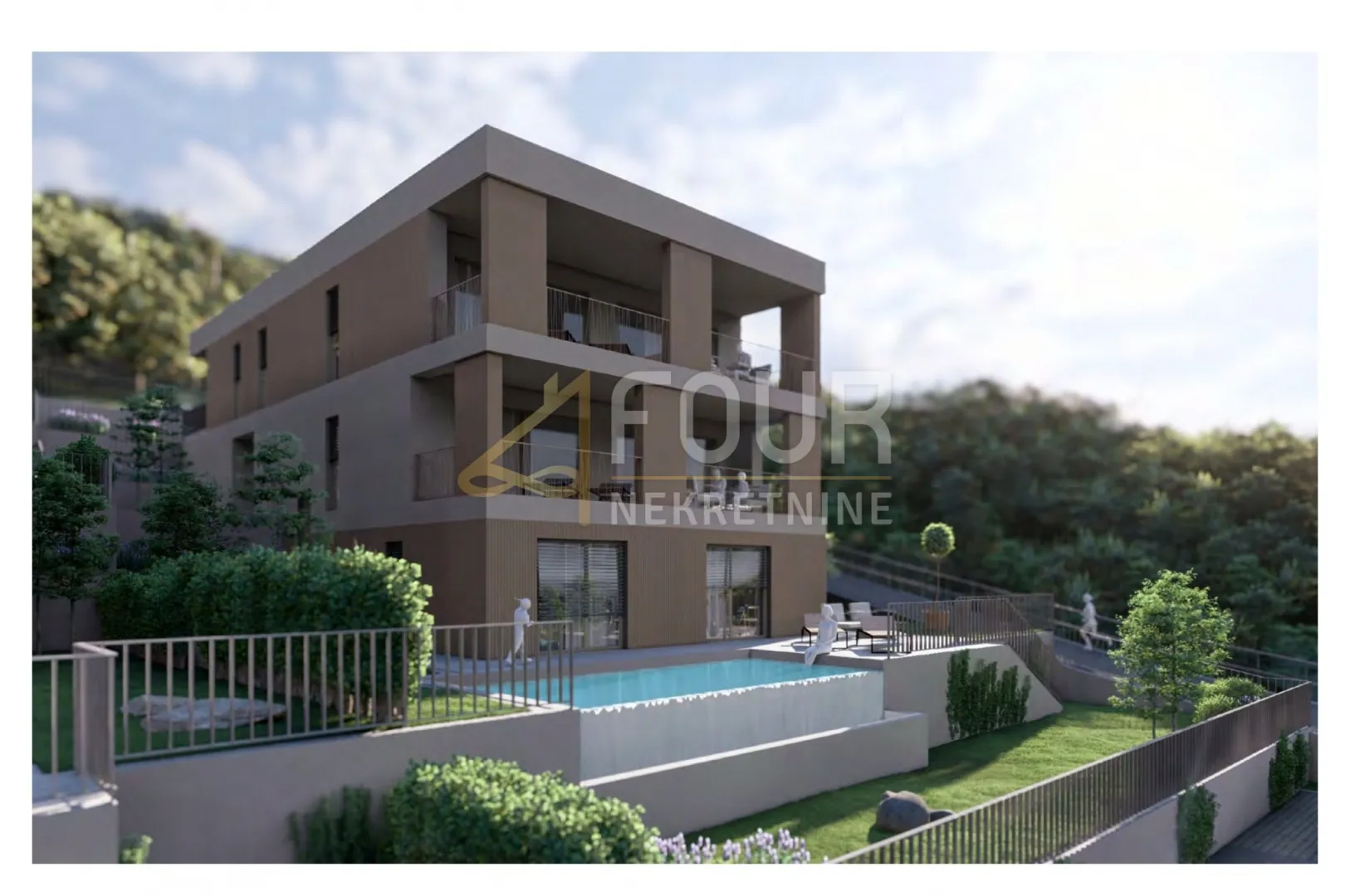 Na odličnoj lokaciji u Kostreni, u mirnom i kvalitetnom okruženju novijih objekata, prodaje se moderan dvoetažni stan s bazenom u vrhunskoj novogradnji! Upravo ova pozicija osigurava spektakularan, potpuno otvoren pogled na more. Ukupna neto površina stana iznosi 251.58 m2, a riječ je o dvoetažnom stambenom prostoru. Ukupna površina unutarnjih prostora iznosi 185 m2, dok vanjski prostori obuhvaćaju čak 123 m2 te uključuju natkrivenu terasu površine 25 m2, natkriveni ulaz od 4 m2, vanjsku terasu od 15 m2, prostranu terasu od 57 m2 te privatni bazen površine 22 m2 koji pripada ovoj stambenoj jedinici. Stanu pripadaju i dva vanjska parkirna mjesta. Na etaži prizemlja smještena je veća spavaća soba s kupaonicom i garderobom, kuhinja s ostavom i blagovaonom, dnevni boravak i toalet. Iz spavaće sobe omogućen je izlaz na manju vanjsku terasu, a iz dnevnog boravka/blagovaone na vanjsku natkrivenu terasu. Na donjoj etaži smještene su tri spavaće sobe, dvije kupaonice te spremište i vešeraj. Iz prostorija na donjoj etaži omogućen je pristup većoj vanjskoj terasi i pripadajućem bazenu. Stan će biti opremljen kvalitetnom ALU stolarijom, protuprovalnim vratima, električnim roletama i komarnicima na svim prozorima. Sustav grijanja predviđen je putem dizalice topline zrak–voda koja omogućuje podno grijanje i pripremu sanitarne tople vode, dok će svaka prostorija imati vlastiti multisplit klima uređaj. Također je izvedena priprema za solarnu elektranu. Završni materijali uključuju kvalitetne parkete i modernu opremu. Nekretnina se prodaje po principu „ključ u ruke“. Kombinacija mirne lokacije, kvalitetne gradnje, vrhunske opreme, vrlo dobrog rasporeda prostora i iznimnog pogleda na more čini ovu nekretninu izuzetno zanimljivom! Poštovani klijenti, agencijska provizija naplaćuje se u skladu s Općim uvjetima poslovanja. ID KOD AGENCIJE: S4491 Ured Rijeka Mob: +385989671287 Tel: +385914944144, +38551619770 E-mail: info@four-nekretnine.hr www.four-nekretnine.hr Predrag Maras Agent s licencom Mob: +385915364019 Tel: +385914944144, +38551619770 E-mail: predragmaras@four-nekretnine.hr www.four-nekretnine.hr