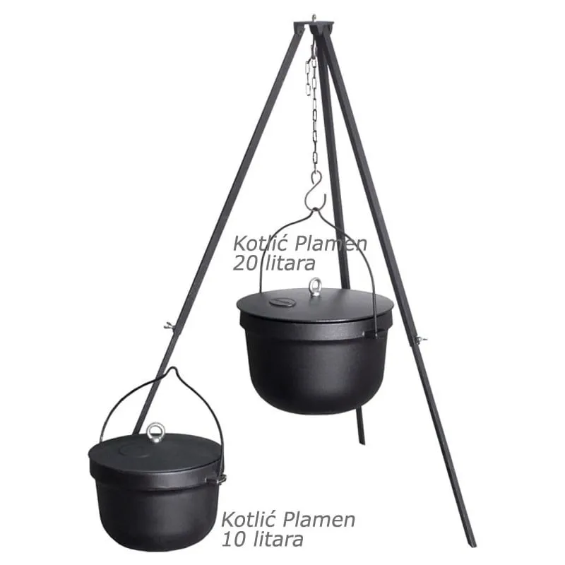 Kotlić Plamen s poklopcem napravljen od sivog ljeva je proizvod namjenjen za pripremu hrane na otvorenom prostoru. Hrana u kotliću se priprema na prirodan način loženjem drva ili drvenog uglja ispod kotlića koji visi na nogarama. Kotlić se lagano održava jer je emajliran s unutarnje strane higijenskim emajlom. Nogari ne dolaze sa kotlićem i naručuju se posebno. Dostupne veličine Mali Veliki Kapcitet 10 l 20 l Težina (bez nogara) 12,50 kg 16,80 kg