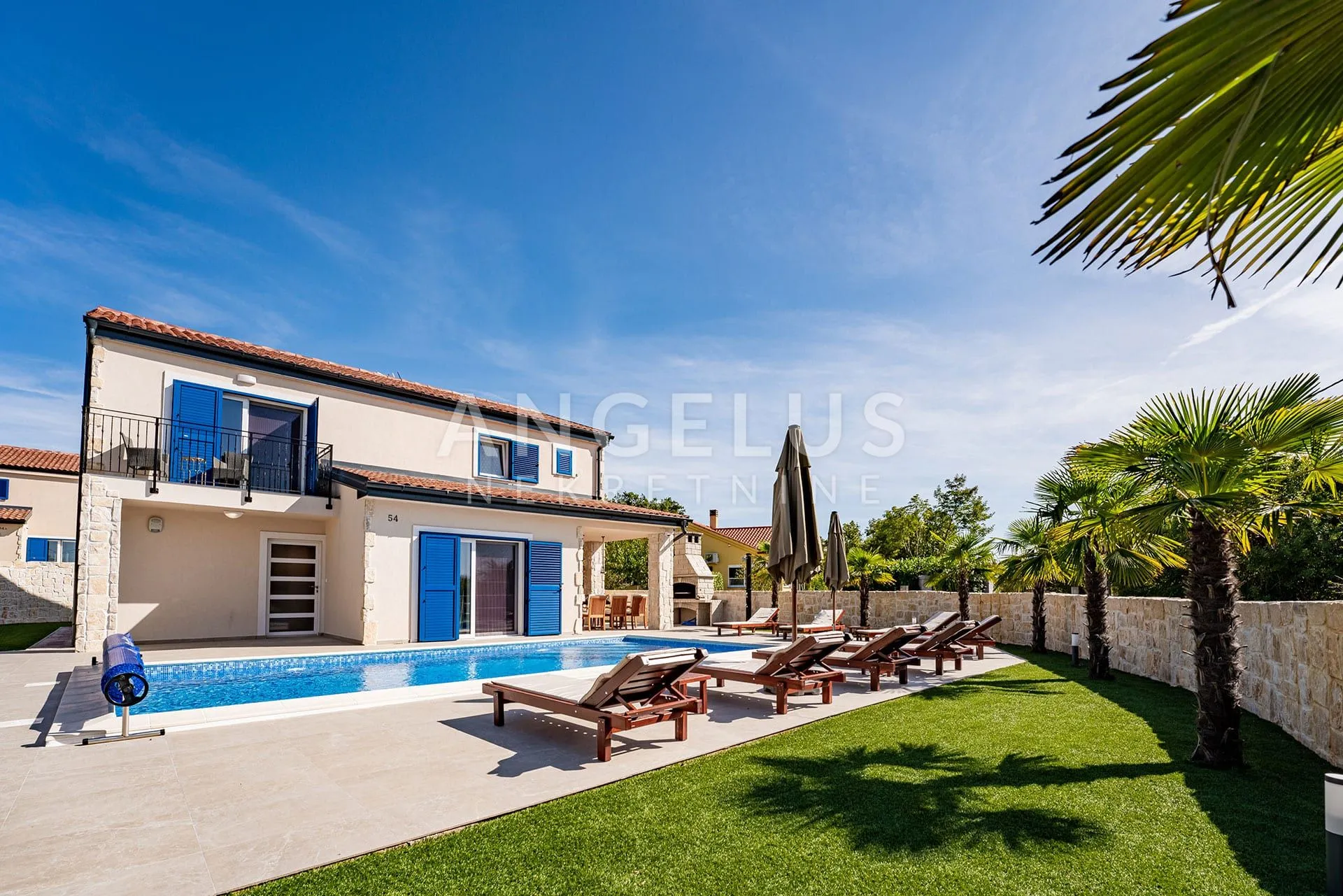 Angelus Nekretnine d.o.o. nude vam na prodaju ovu luksuzno opremljenu Mediteransku Vilu sa grijanim bazenom, smještenu na mirnoj lokaciji u unutrašnjosti otoka Krka, orijentiranu prema suncu i zelenilu kroz cijelu godinu.