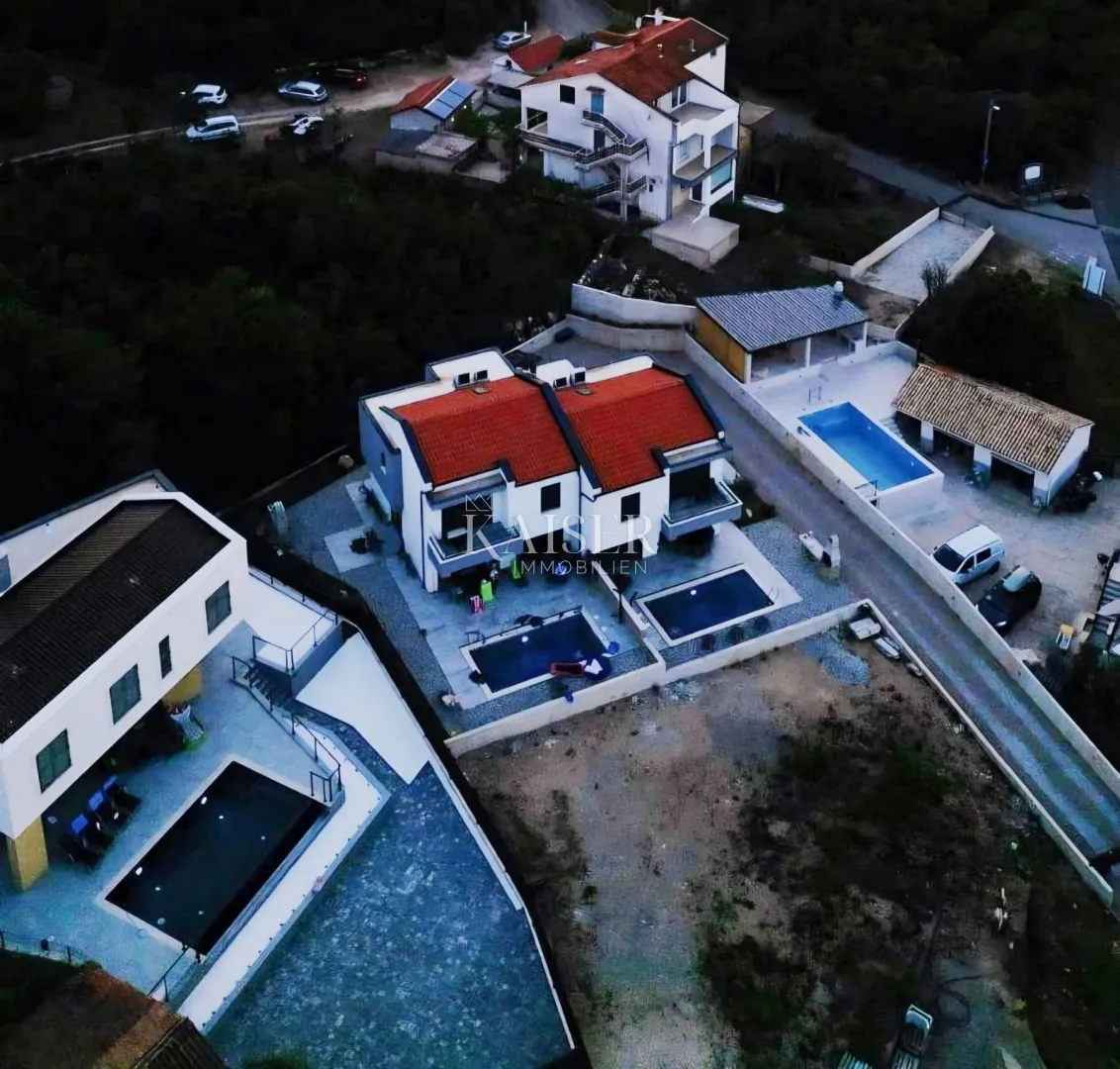 Kaiser Immobilien posreduje u prodaji dvije moderno opremljene dvojne kuće sa bazenima u mjestu Risika, otok Krk. Nekretnine se nalaze na predivnoj lokaciji sa panoramskim pogledom na more. Nekretnine, u naravi dvije jednake dvojne kuće 150m2 + 150m2, ukupno 300m2 stambene površine razvedene su na dvije etaže, prizemlje i kat. Svaka kuća funkcionira kao zaseban objekt sa odvojenim ulazima, brojilima i potrošačima. U prizemlju svake kuće se nalazi kuhinja koja zajedno sa blagovaonicom i dnevnim boravkom predstavlja predivan koncept otvorenog prostora s izlazom na terasu sa koje se pruža spektakularan pogled na more i Sjeverni Velebit. Osim navedenih prostorija, u prizemlju svake kuće se također nalaze wc i vešeraj. Na prvom katu svake kuće se nalaze po tri spavaće sobe, dvije moderno uređene kupaonice, garderoba i balkon sa kojeg se također pruža nesmetani pogled na more i predivan krajolik. Ugrađeno je podno grijanje te klima uređaji u svakoj prostoriji, što omogućuje ugodan boravak tijekom cijele godine. Za sanitarni otpad se koristi bio jama, no izvršena je priprema za kanalizaciju na koju će se spojiti kada kroz naselje bude provedena ista. Na uređenoj okućnici nalaze se bazeni sa sunčalištem, grill zone sa vrtnim roštiljem, a same okućnice su uređene u primorskom stilu i samoodržive. Na njima prevladavaju predivne mediteranske biljke poput maslina, palmi, ružmarina, lavande i agava. Posebnost ovih nekretnina je i dodatno očišćeno i poravnato zemljište ispred objekata, ukupne površine 500m2 koje je u cijeni. Prekrasna pješčana plaža Sv. Marek nalazi se na 1.600m. Također se u blizini nalaze i trgovina, javni prijevoz te Vrbnik kao najbliži grad, udaljen 5000 metara, nudi mogućnost uživanja u predivnim vinima, restoranima i svim važnijim sadržajima. Sva dokumentacija uredna, vlasništvo čisto, nekretnine se prodaju opremljene i namještene. ID KOD 105-328 Provizija agencije za kupca iznosi 3% + PDV i plaća se u slučaju kupovine nekretnine, kod zaključenja prvog pravnog akta. ID KOD AGENCIJE: 105-328 Lado Patekar Agent s licencom u posredovanju u prometu nekretnina Mob: +385919390220, +385995677888 E-mail: lado@kaiser-immobilien.hr www.kaiser-immobilien.hr