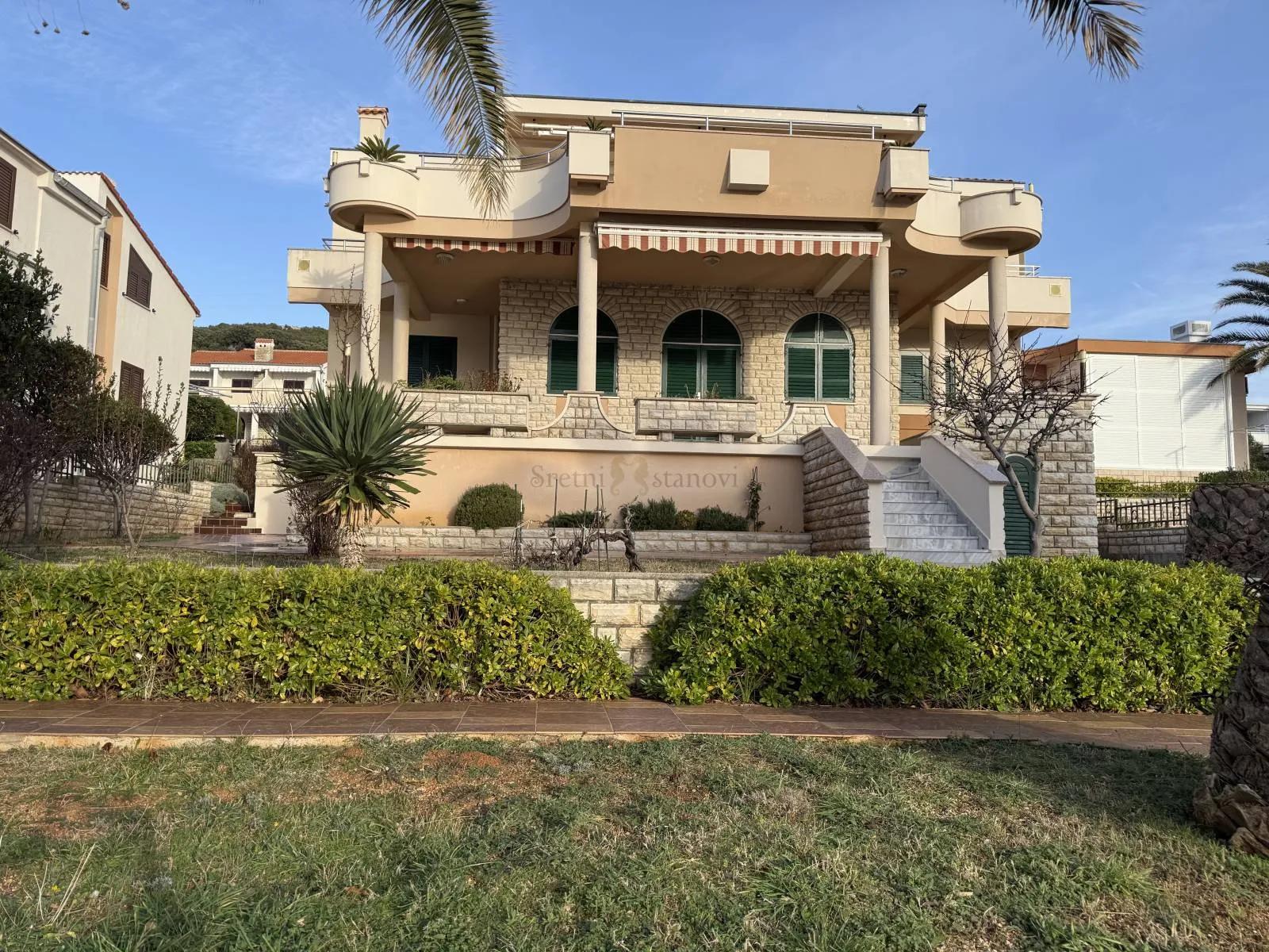 Prodaje se kuća 1. red do mora u Staroj Novalji, idiličnom mjestu na otoku Pagu posvećenom obiteljskom turizmu. Kuća ima neometan, otvoreni pogled na more, od kojega je djeli samo mala šetnica, s prekrasnom, velikom rivom i pješčanom plažom. Imanje se sastoji od 2 objekta, terase, vrta i parkinga. Parking je vanjski te natkriven tendom, s 4 parkirnih mjesta. Na velikoj terasi postoji kamin te ljetna kuhinja s provedenim instalacijama struje i vode. Manji objekt je 1 luksuzan studio apartman prepun svjetlosti, okružen terasom s vanjskim tušem i s prekrasnim pogledom na more, sa staklenim stjenama koje omogućuju potpuno otvaranje apartmana sa svih strana. Sastoji se od dnevne prostorije s kuhinjom s velikim šankom i kupaone. Glavni objekt sastoji se od velike tehničke prostorije s vešerajem i velike konobe u suterenu, jednog apartmana u prizemlju i 2 apartmana na 1. katu. Svi apartmani imaju prekrasan i otvoren pogled na more. Apartman u prizemlju ima oko 150 m2 i sastoji se od ulaznog hodnika, terase, dnevnog boravka s kaminom, kuhinje i blagovaone, 3 spavaće sobe i 2 kupaone. Prvi apartman na katu ima oko 90m2 i sastoji se od ulaznog hodnika, dnevnog boravka, kuhinje i blagovaone, dvije spavaće sobe, kupaone i velike terase. Drugi apartman na katu ima oko 60 m2 te se sastoji od ulaznog hodnika, dnevnog boravka, kuhinje i blagovaone, 2 spavaće sobe, kupaone i balkona. U dvorištu se nalaze palme, masline i cvijeće. U dvorištu ima mjesta za bazen. Stolarija je nova, s drvenim griljama. Uz kuću dolaze i 3 veza za brodove. _________________________ EN This house for sale is in 1st row to the sea in Stara Novalja, an idyllic place on the island of Pag dedicated to family tourism. The house has an unobstructed, open view of the sea, with a beach 5 meters away from the house. The property consists of 2 buildings, a terrace, a yard and a parking lot. The parking lot is outside and covered with an awning, with 4 parking spaces. On the large terrace there is a fireplace/grill and a summer kitchen with electricity and water installations. The smaller object is 1 luxurious studio apartment full of light, surrounded by a terrace with an outdoor shower and a beautiful view of the sea, with glass walls that allow the apartment to be completely opened from all sides. It consists of a living room with a kitchen with a large bar and a bathroom. The main building consists of a large technical room with a laundry room, a large tavern/cave, 1 apartment on the ground floor and 2 apartments on the 1st floor. All apartments have a beautiful and open view of the sea. The apartment on the ground floor is about 150 m2 and consists of an entrance hall, terrace, living room with fireplace, kitchen and dining room, 3 bedrooms and 2 bathrooms. The first apartment on the 1st floor is about 90m2 and consists of an entrance hall, living room, kitchen and dining room, 2 bedrooms, bathroom and a large terrace. The second apartment on the 1st floor is about 60 m2 and consists of an entrance hall, living room, kitchen and dining room, 2 bedrooms, bathroom and balcony. There are palm trees, olive trees and flowers in the yard. There is enough space for a swimming pool in the yard. The windows are new, with wooden shutters. The house comes with 3 boat moorings. ID KOD AGENCIJE: 7761 Andrea Zeneral Mob: 099 673 1949 Tel: 051/301-502 E-mail: andrea@sretnistanovi.hr www.sretnistanovi.hr Helga Zeneral Mob: 099 415 8314 Tel: 051/301-502 E-mail: helga@sretnistanovi.hr www.sretnistanovi.hr